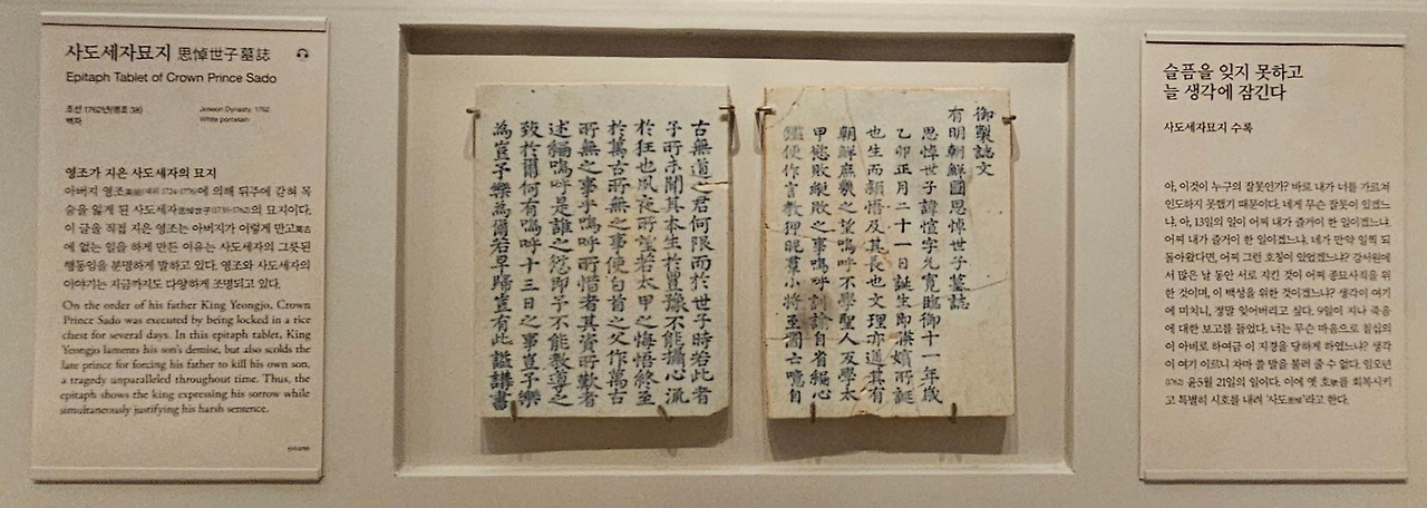 아버지 영조에 의해 뒤주에 갇혀 죽은 사도세자의 묘지다. 영조가 직접 지었다. 원인이 세도세자의 그릇된 행동이라고 적혀있다. 슬픔을 잊지 못하고 늘 생각에 잠긴다라고 하였다.