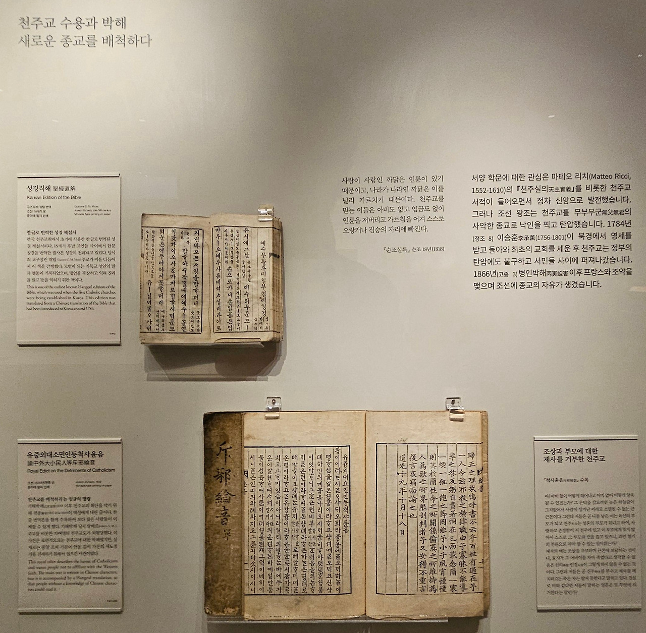마테오리치(1552~1610)의 천주실의등 천주교 서적이 들어오면서 점차 신앙으로 발전했다. 그러나 ㅈ선왕조는 무부무군의 사악한 종교로 낙인찍었다. 1784년(정조 8) 이승훈(1756~1801)이 북경에서 영세를 받았다. 돌아와 최초의 교회를 세웠다. 1866년(고종 3) 병인박해 이후 프랑스와 조약을 맺으며 종교의 자유가 생겼다.
