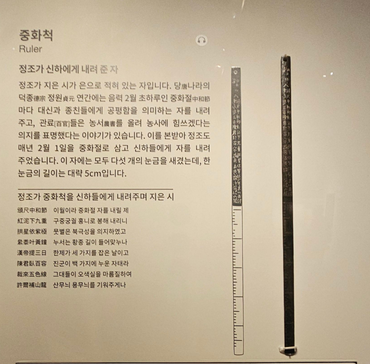 정조의 시가 적혀 있는 자다. 당나라 덕종 정원 연간에는 음력 2월 초하루인 중화절마다 대신과 종친들에게 공평함을 의미하는 자를 내려주고, 관료 백관들은 농서를 올려 농사에 힘쓰겠다는 의지를 표명했다는 이야기가 있다. 정조도 매년 2월 1일을 중화절로 삼고 신하들에게 자를 내려 주었다. 모두 다섯 개의 눈금을 새겼는데, 한 눈금 길이는 약 5cm다.