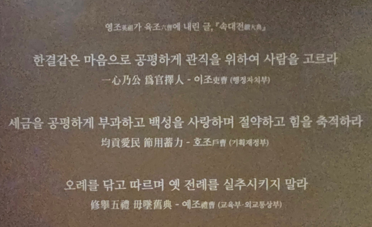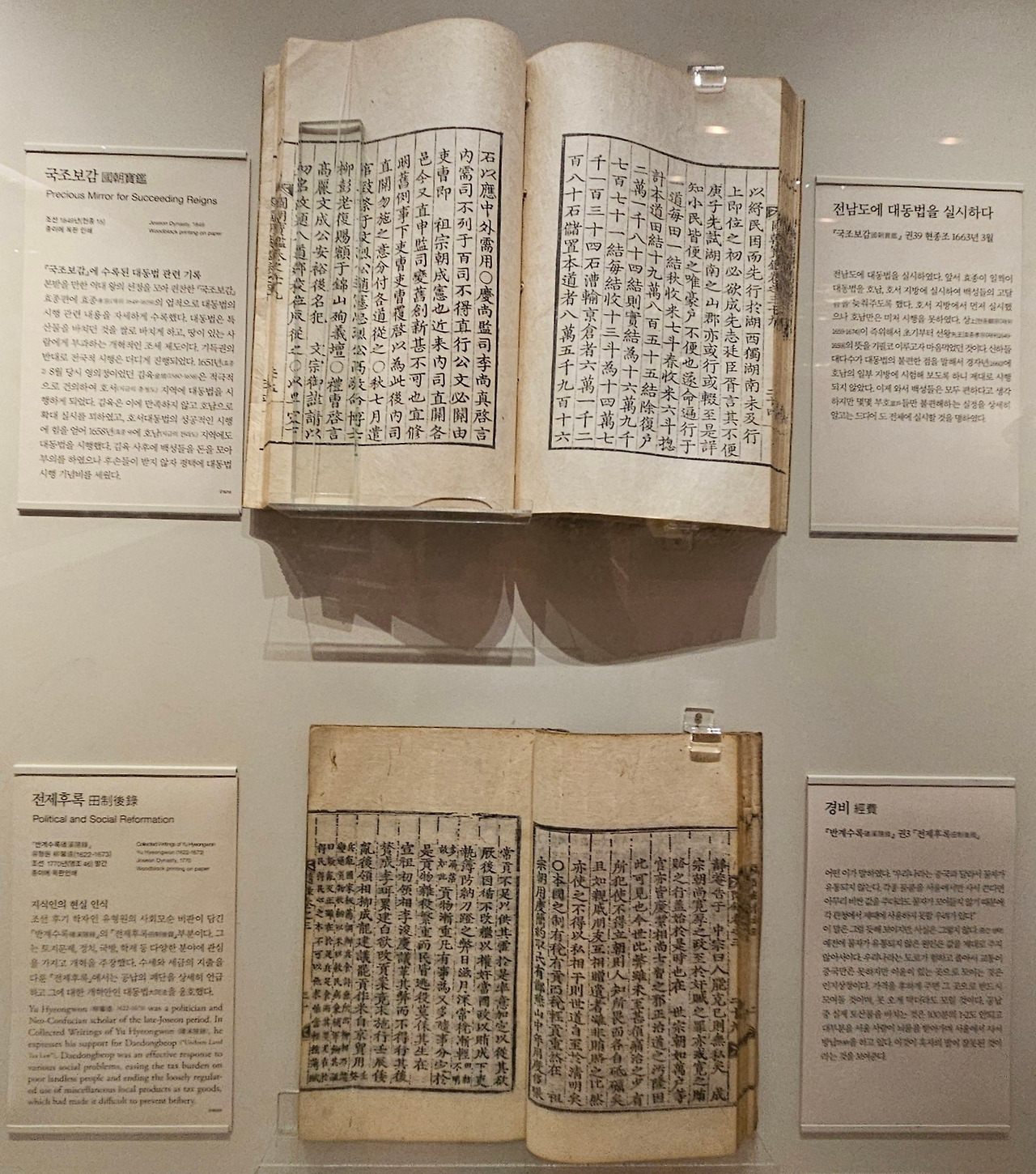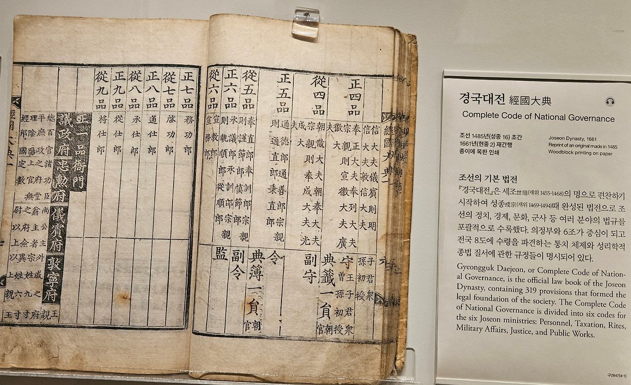 세조(1455~1468)가 시작하여 성종(1469~1494) 때 완성된 법전이다. 정치 경제 문화 군사 등 여러 분야의 법규를 수록했다. 의정부와 6조가 중심이 되고 전국 8도에 수령을 파견하는 통치 체제와 성리학적 질서 규정이 명시되어 있다.