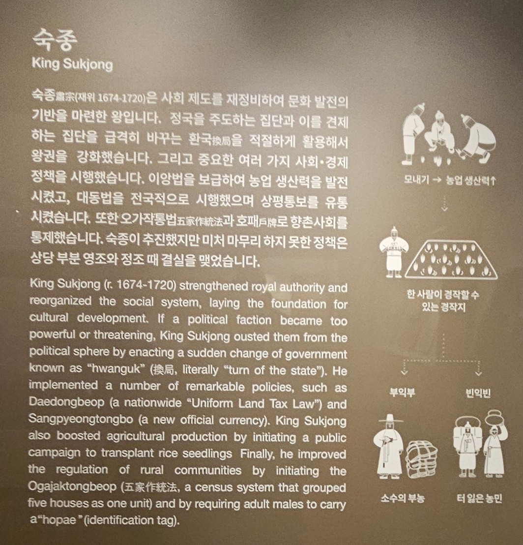 사회 제도를 재정비하여 문화 발전의 기반을 마련했다. 견제하는 집단을 급격히 바꾸는 환국을 활용하여 왕권을 강화하였다. 이앙법을 보급하고, 대동법을 전국적으로 시행했다. 상평통보를 유통시켰다. 오가작통법과 호패로 향촌사회를 통제했다. 마무리 못한 정책은 영조와 정조대에 결실을 맺었다.