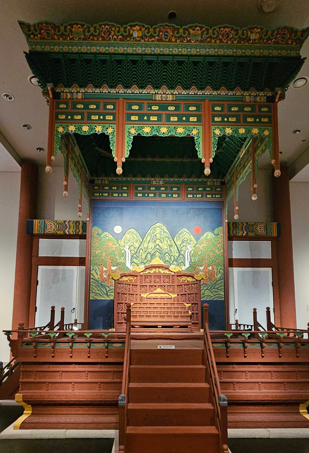 어좌 뒤에는 일월오봉(해 달 다섯 봉우리) 병풍을 설치했다. 천정은 용문양으로 장식했다. 용은 왕을 상징한다.