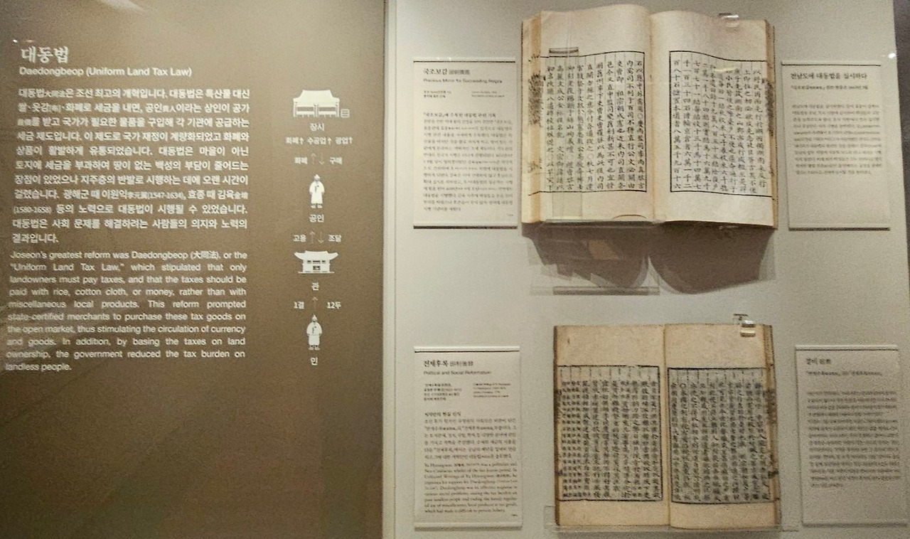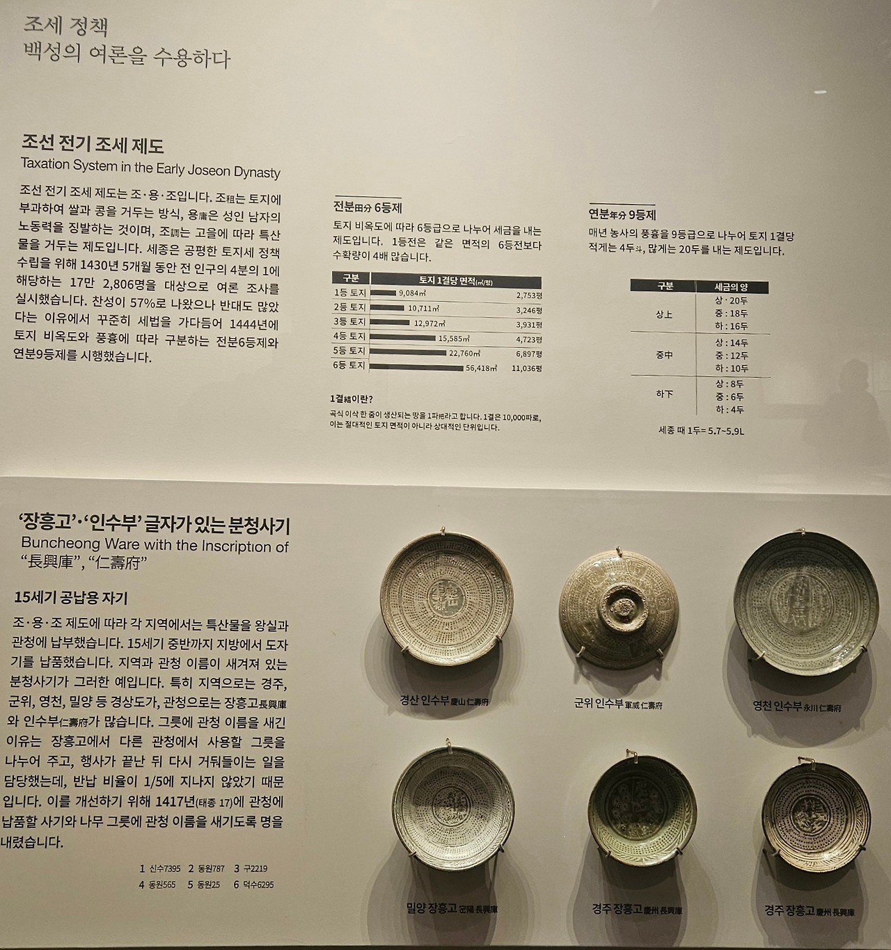 조 용 조가 세제의 기본이다. 조는 토지에 부과하여 쌀과 콩을 거두는 방식, 용은 성인 남자의 노동력 징발, 조는 고을의 특산물 거두는 제도다. 세종은 1430년 5개월 동안 전인구의 1/4인 17만 2,806명을 대상으로 여론조사를 실시하였다. 찬성이 57%였다. 좀 더 가다듬어 1444년 토지 비옥도에 따른 전분 6등제, 흉년과 풍년에 따른 연분 9등제를 시행하였다.