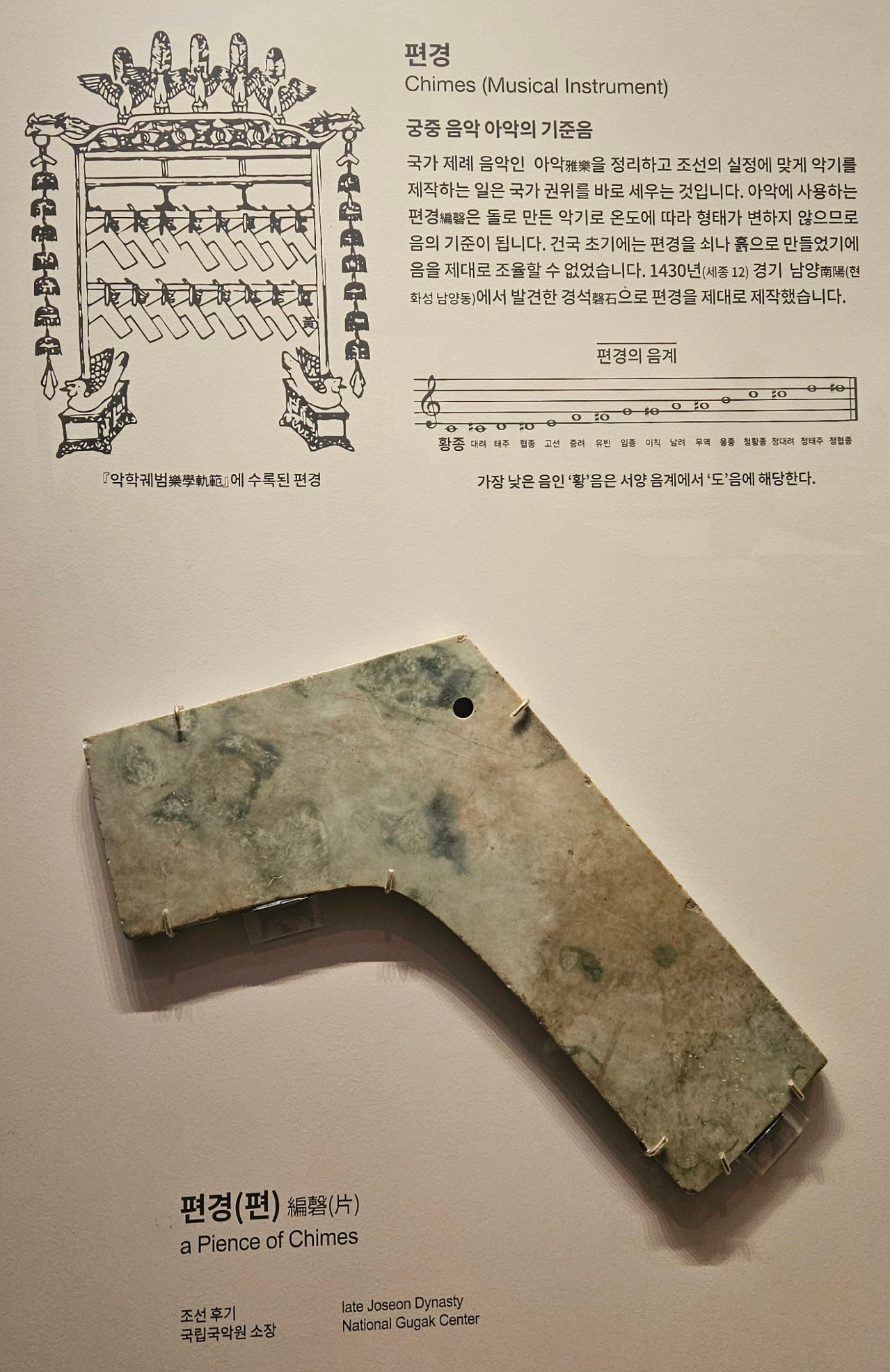 편경은 돌로 만든 악기로 온도에 따라 형태가 변하지 않으므로 음의 기준이 된다. 1430년(세종 12) 경기 남양(현 화성 남양동)에서 발견된 경석으로 만들었다.