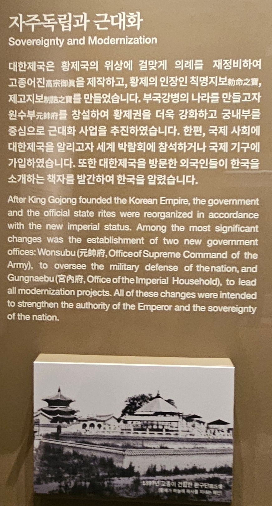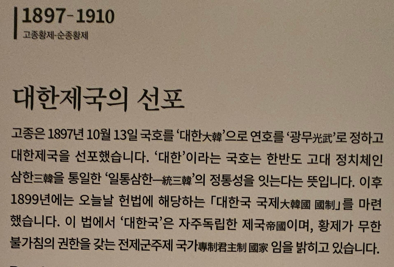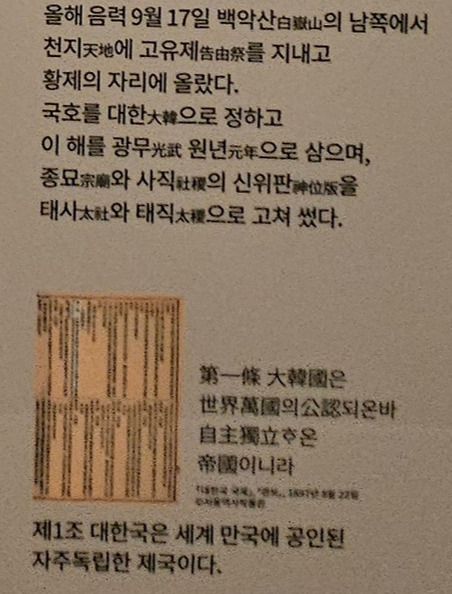 고종은 1897년 10월 13일 국호를 '대한(大韓)'으로 연호를 '광무(光武)로 정하고 대한제국을 선포했다. 대한은 삼한(三韓)의 정통성을 계승한다는 뜻이다. 1899년에는 헌법인 '대한국 국제(大韓國 國制)'를 만들었다. 9월 17일 백악산의 남쪽에서 하늘과 땅에 고유제를 지내고 황제의 자리에 올랐다.