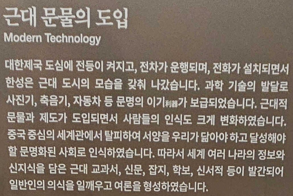 도심에 전등이 켜지고, 전자 운행, 전화설치되면서 한성은 근대 도시 모습을 갖추어 갔다. 과학 기술의 발달로 사진기 축음기 자동차등 문명의 이기가 보급되었다. 교과서 신문 잡지 학보 신서적 등이 발간되어 의식을 깨우고 여론을 형성하였다.