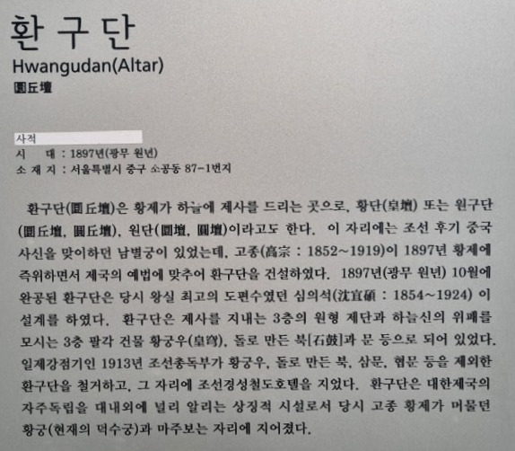 1897년 고종이 러시아 공사관에서 경운궁(덕수궁)으로 환궁하면서 환구단에서 대한제국 황제로 즉위하였다. 그 지긋지긋한 중국과의 사대관계가 비로소 끝났다. 경운궁 옆에 있던 청나라 사신을 맞이하던 남별궁을 허물고, 그 자리에 환구단을 지었다. 황제국의 황제로서 직접 하늘에 제사를 지냈다.
