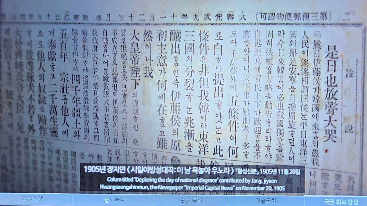 을사늑약 체결에 대하여 1905년 11월 20일, 황성신문 주필 장지연은 시일야방성대곡(이 날 목놓아 우노라)을 썼다.