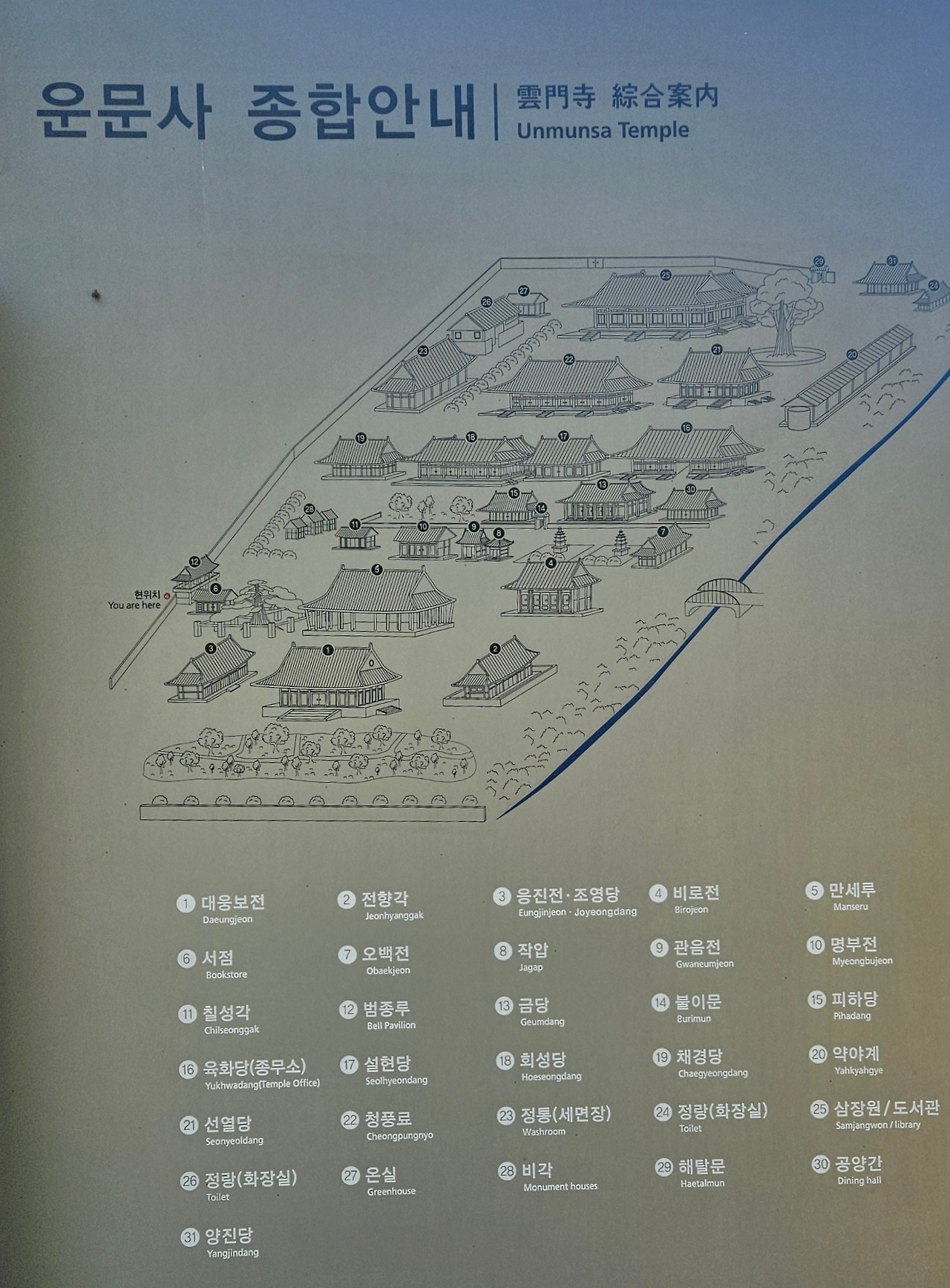 최근에 대대적으로 새롭게 정비를 하고 있는 듯, 드넓은 주차장에 매점 화장실 식당 카페 몇 개소가 전부다. ‘운문사 정류장 슈퍼’ 주인분께 버스 운행 시간표를 물어보니, 창문을 가리키며 손 글씨로 종이에 적어 붙여 놓으셨단다. 이심전심, 진심이 전해져 온다.
