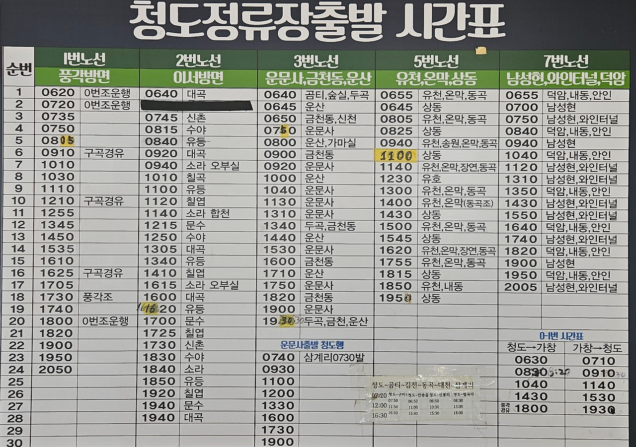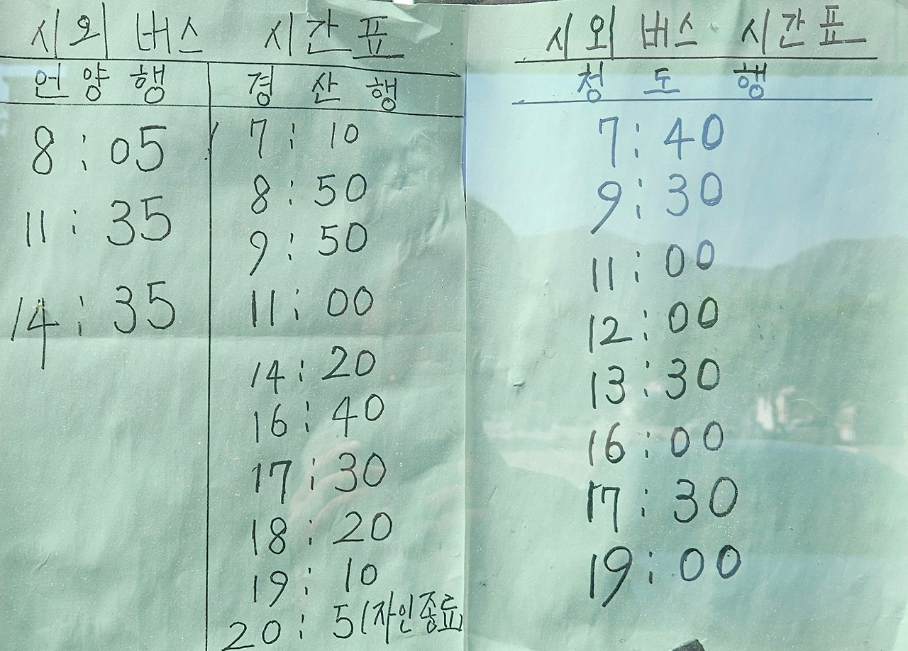 버스 운행시간표를 보고 있는데, 뒤쪽에서 어떤 할머니가 운문사로 출발하는 버스 시간표를 좀 읽어 달라고 하셨다. "11:30분"이라고 말씀드렸다.