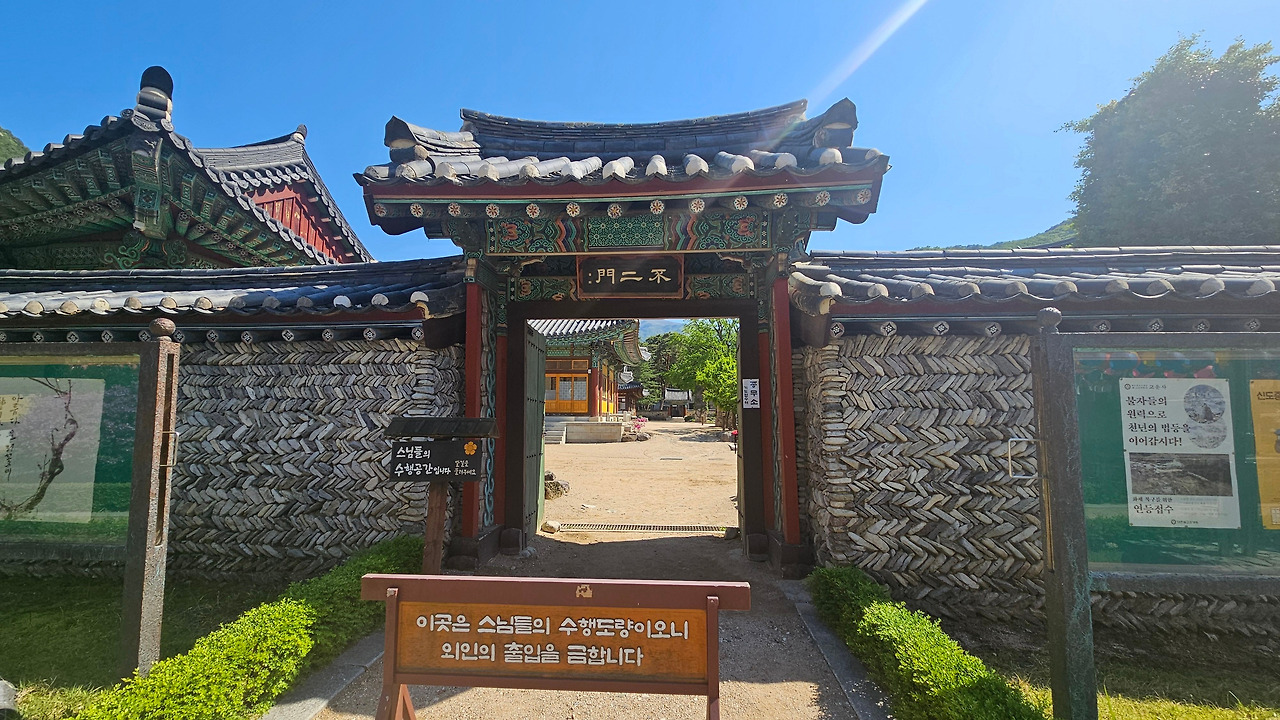 청도 운문사는 일반인 출입이 가능한 예배 영역과 출입이 불가능한 강원 영역이 담장으로 엄격히 구분되어 있으며, 두 영역의 연결 통로가 '불이문(不二門)'이다. 불이문은 '둘이 아님'을 뜻하는 불이에서 유래한 이름으로 세상의 모든 대립적 개념을 초월하여 하나로 합쳐지는 깨달음의 경지를 의미한다.