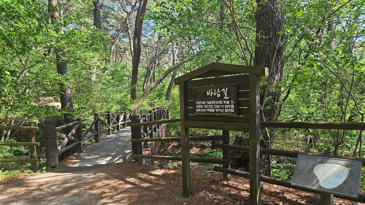 차량통행로 우측 계곡 냇물 바로 옆을 따라 산책하기 좋은 소나무 숲 속 생태탐방로인 솔밭길이 있다. ‘솔바람길’이다. 중간에 법구경 문구가 군데군데 걸려있다.