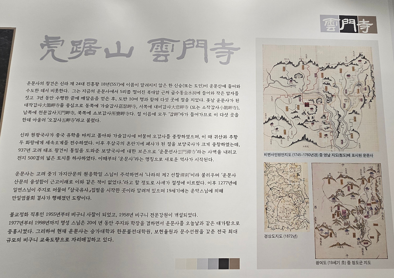 운문사 연대기를 한눈에 만나는 운문사역사관과 상설전시실, 기획전시실과 50석 불교문화강의실, 작품 수장공간 등으로 구성되어 있다.