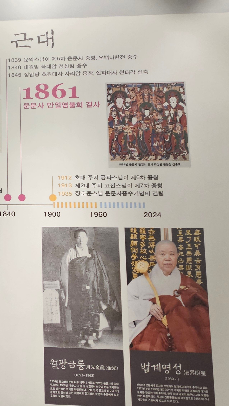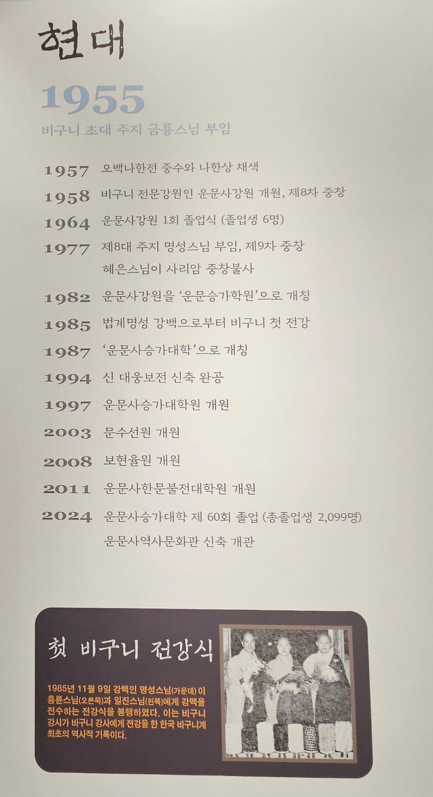 해방 이후 8대부터 12대까지(1977~1998) 명성 비구니 스님이 운문사 주지와 학장을 겸임하면서 대웅보전과 요사 등을 신축하고, 만세루 등 기타 전각들을 중수하는 등 명실공히 대가람으로서의 면모를 일신하였다.