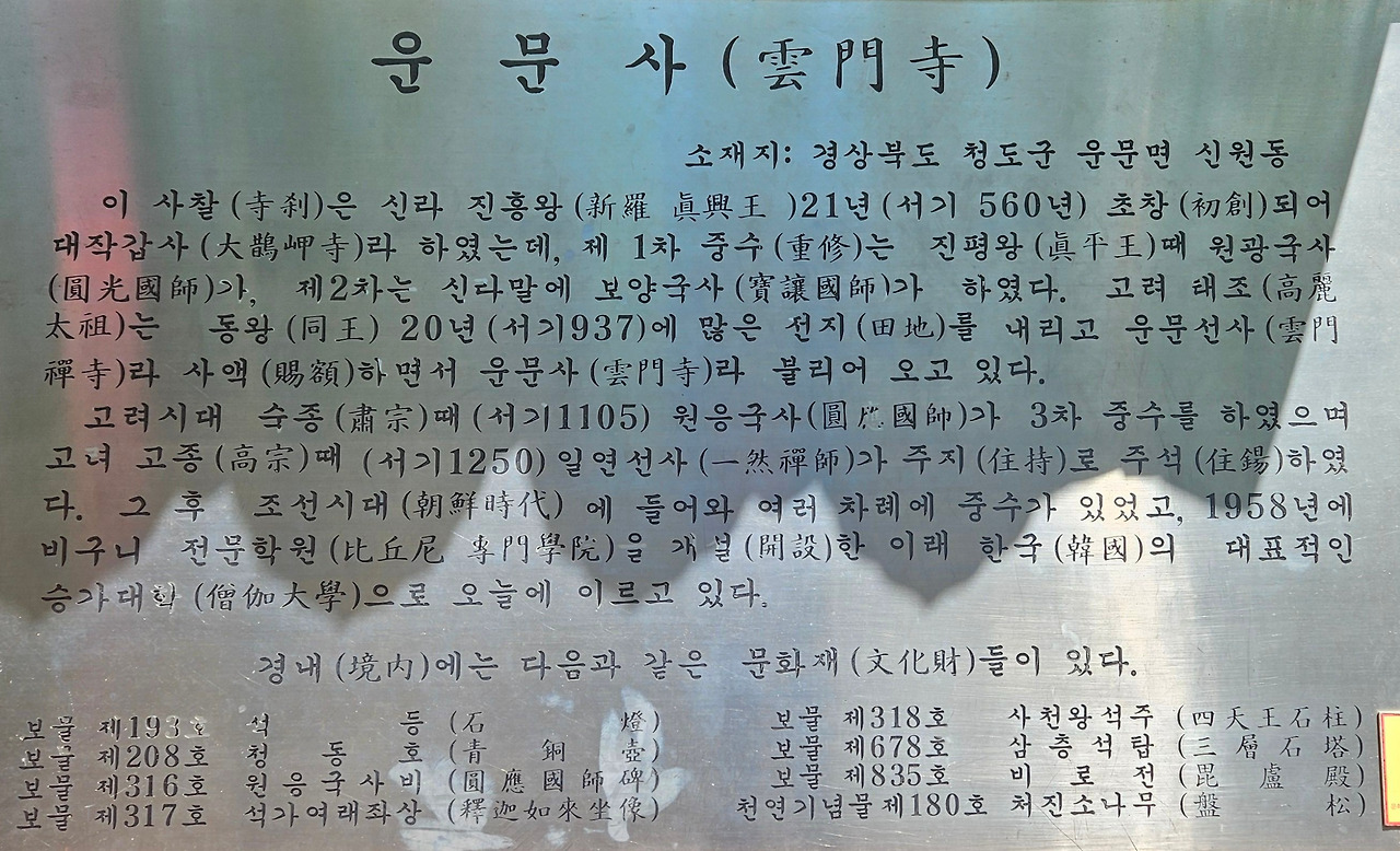 운문사 범종루 우측에 운문사 연혁이 적혀있다.