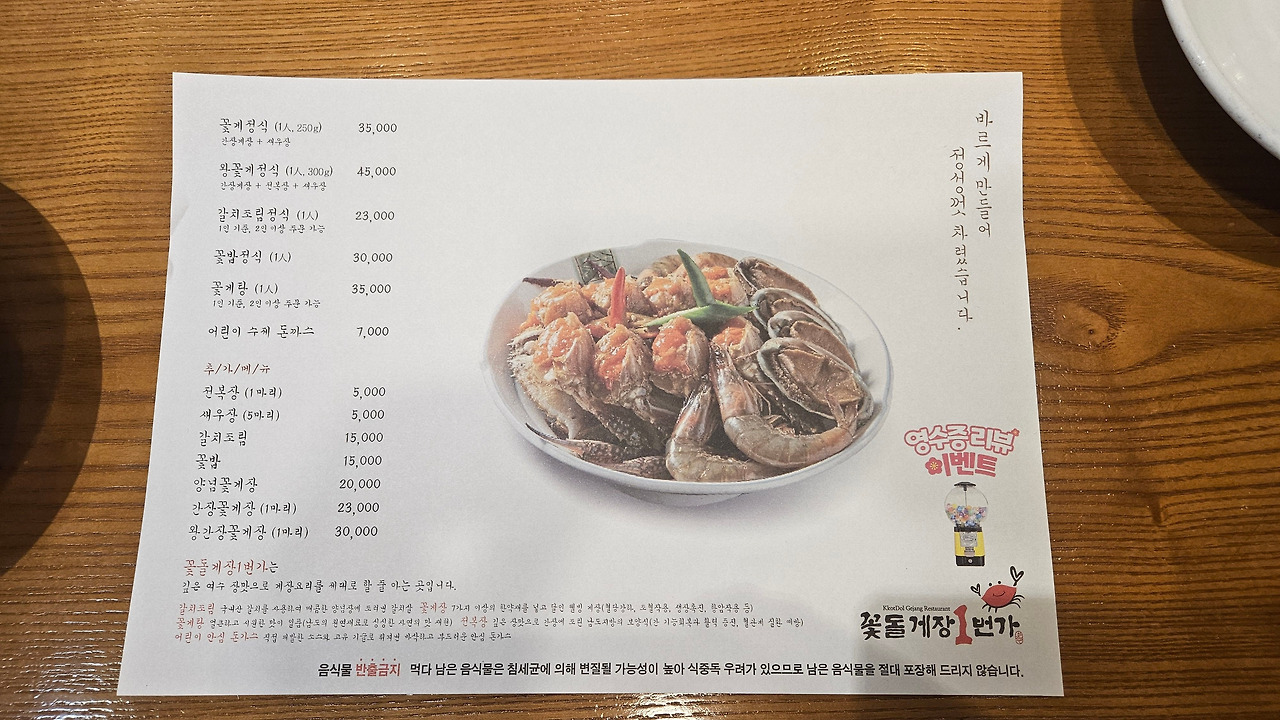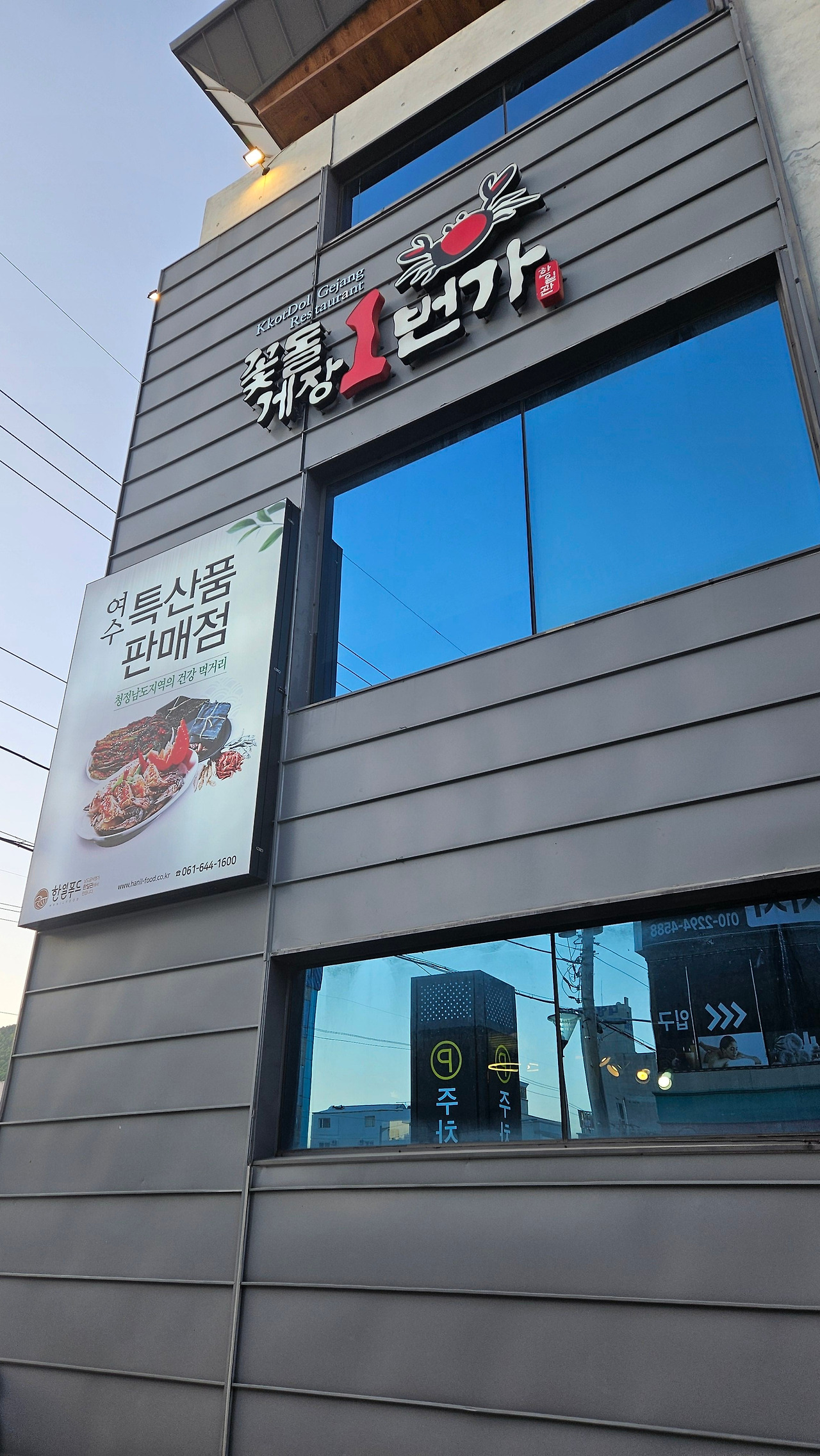 매장에 들어서면 탁 트인 넓은 공간이 한눈에 들어온다. 꽃돌게장 1번가의 경우 돌게정식, 꽃게정식, 꽃게탕 3가지 메뉴를 취급한다. 더하여 나막스매운탕, 불고기, 도라지튀김, 여수 명물인 갓김치, 양태 등 음식들이 함께 차려진다. 맛도 있어 추천은 하지만, 가격이 만만하지 않다.