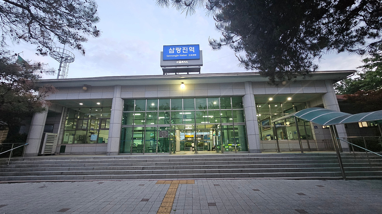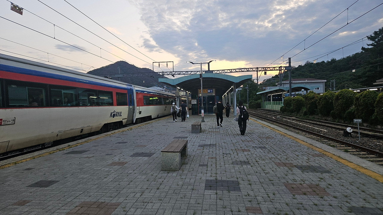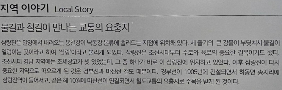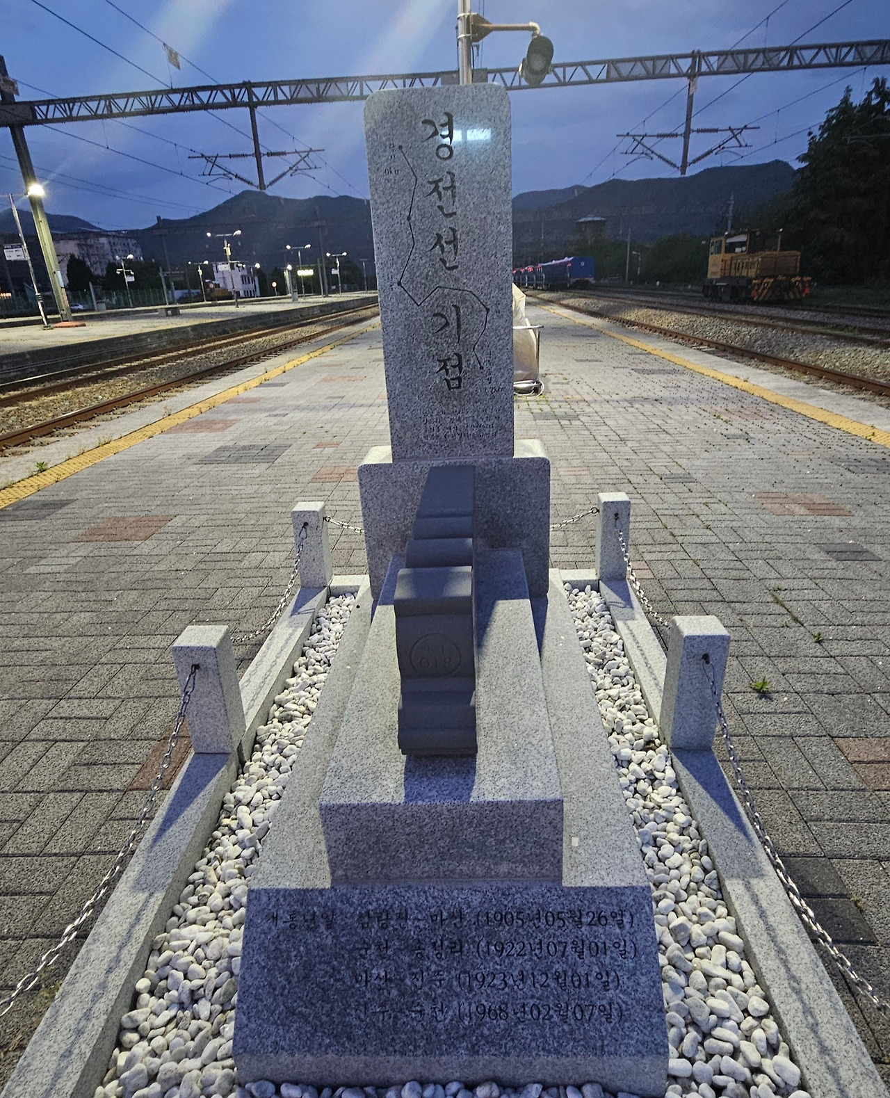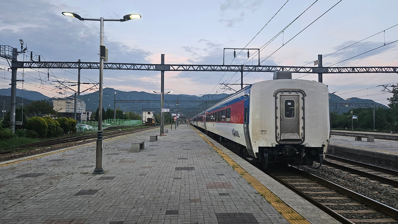 청도역에서 다음 행선지 순천역으로 이동하려면, 경전선의 시발역인 삼랑진역에서 갈아타야 한다. 밀양시 삼랑진역에 도착(19:03)하였을 때, 저녁 석양이 비치고 있었다. 경전선 시점 거리계(표지판)와 급수탑이 보였다. 삼랑진발(19:41) 순천행 시간까지 약간의 여유시간이 있어 역 밖으로 나왔다.