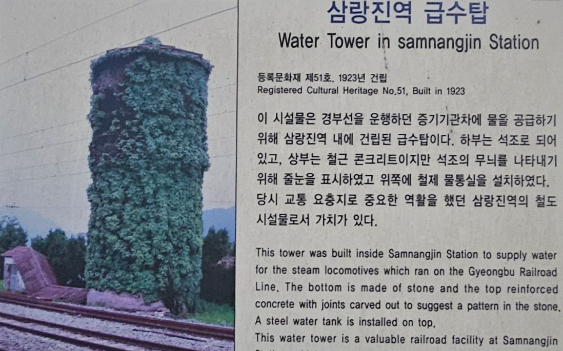 1923년 경부선을 운행하던 증기기관차에 물을 공급하기 위해 지름 6m, 높이 15m로 건립했다. 하부는 석조, 상부는 철근 콘크리트다. 석조의 무늬를 나타내기 위해 줄눈을 표시하였다. 위쪽에는 철제 물통실을 설치했다.