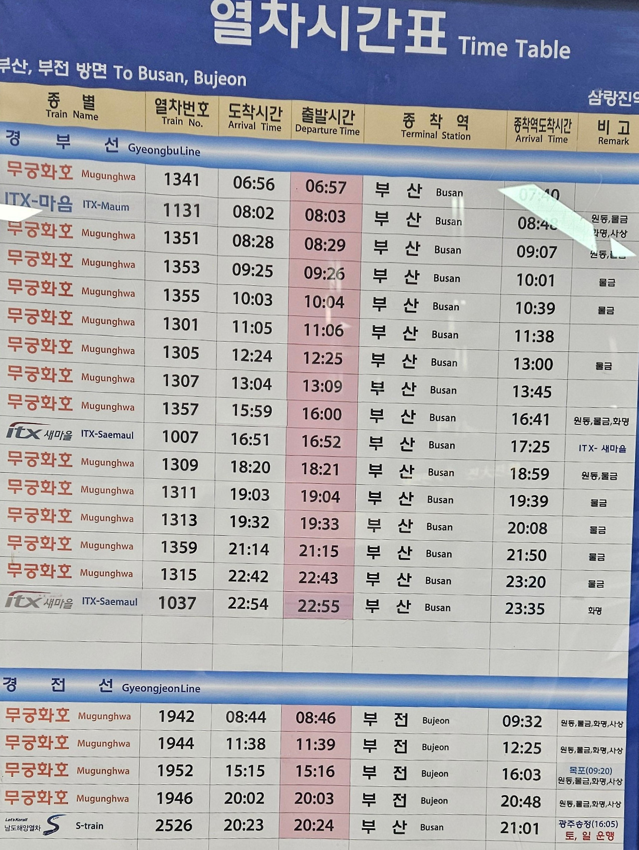 부산, 부전 방면 열차 시간표 (삼랑진 역 기준)