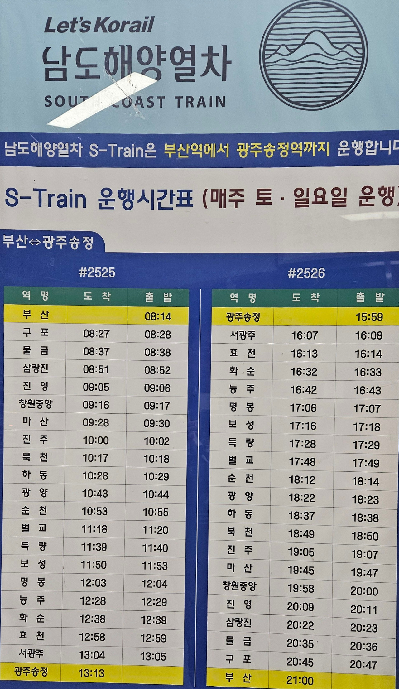 매주 토. 일요일에만 운행하며, 부산역 출발, 전남 광주 송정까지 가는 남도해양 열차다. 바다를 바라보며 여행을 즐길 수 있을 것 같다.