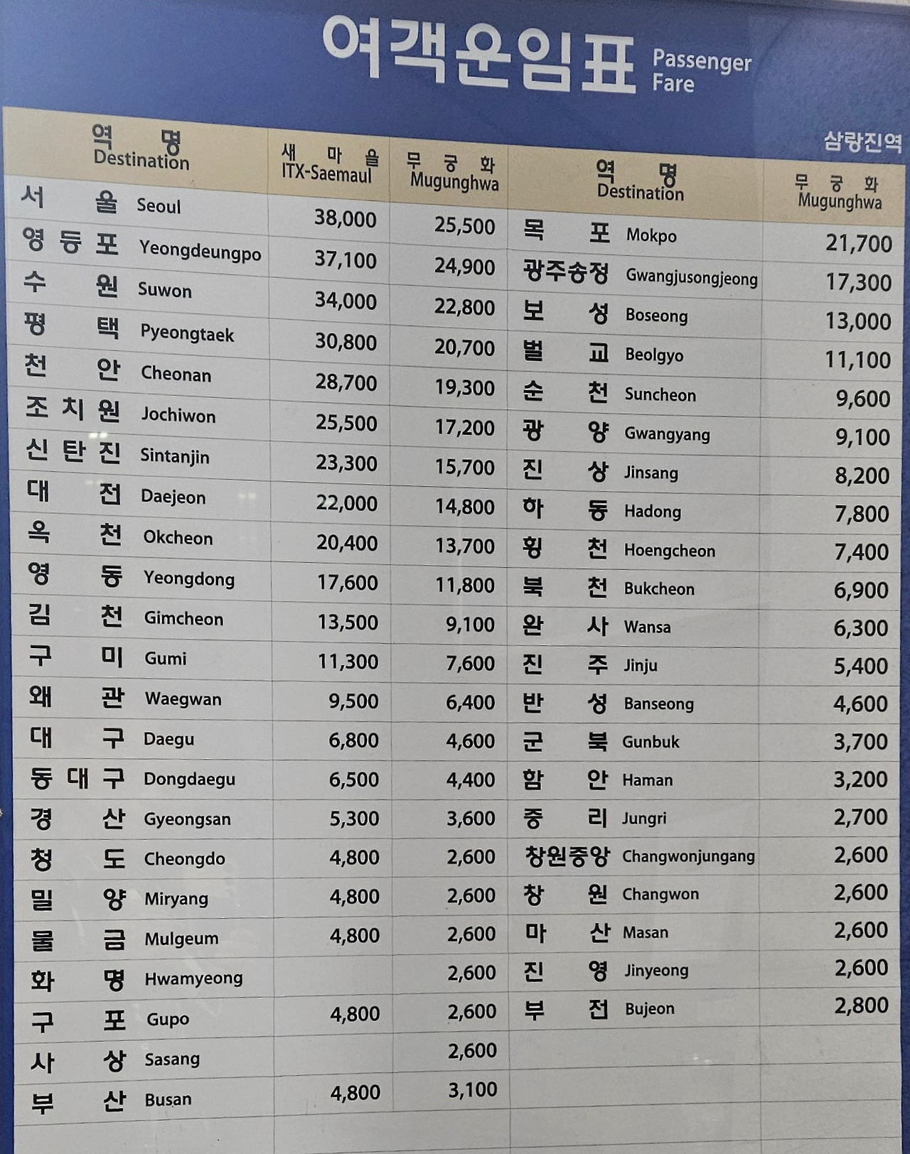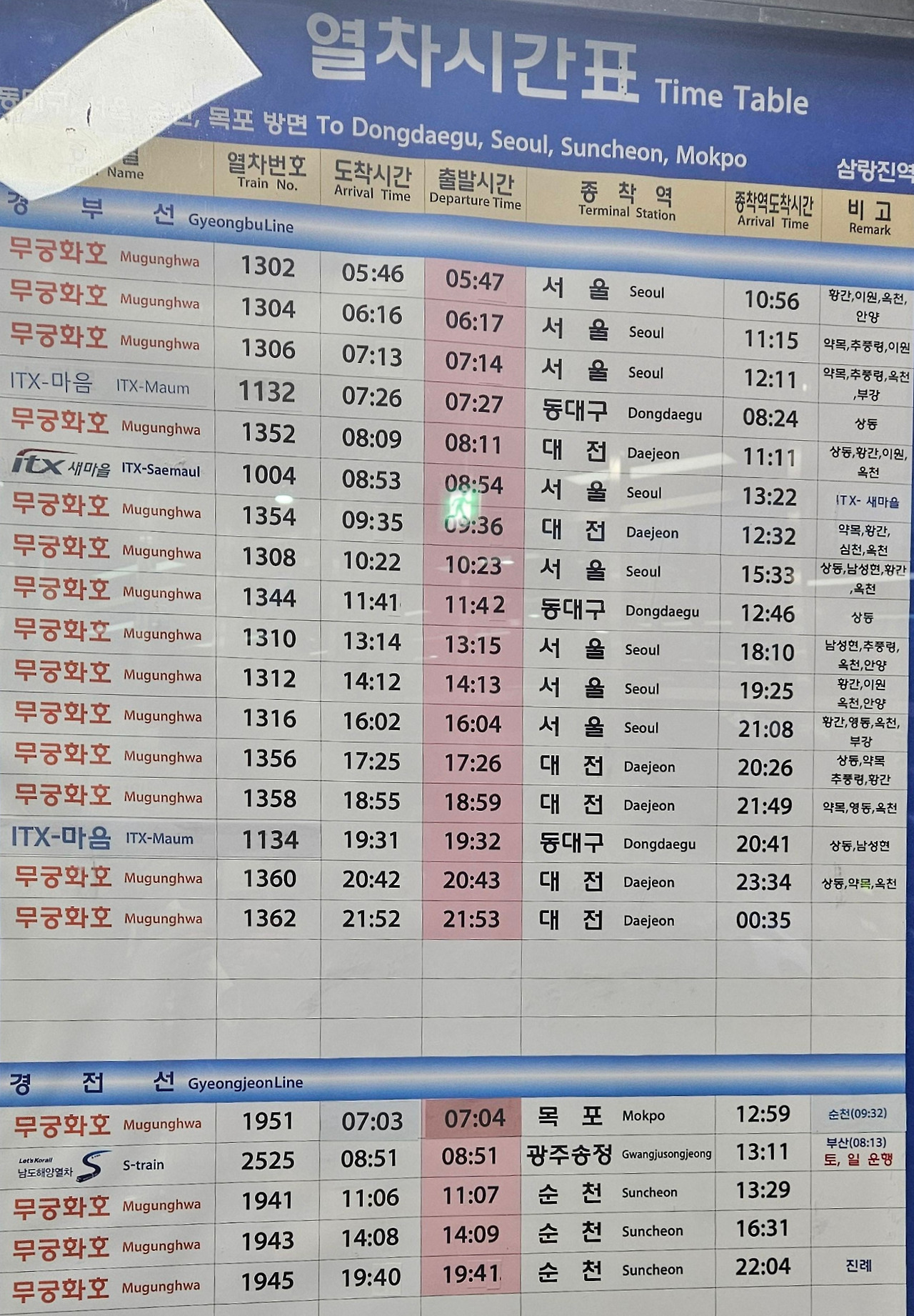 동대구 서울 경전선(순천, 목포) 열차 시간표(삼랑진역 기준)