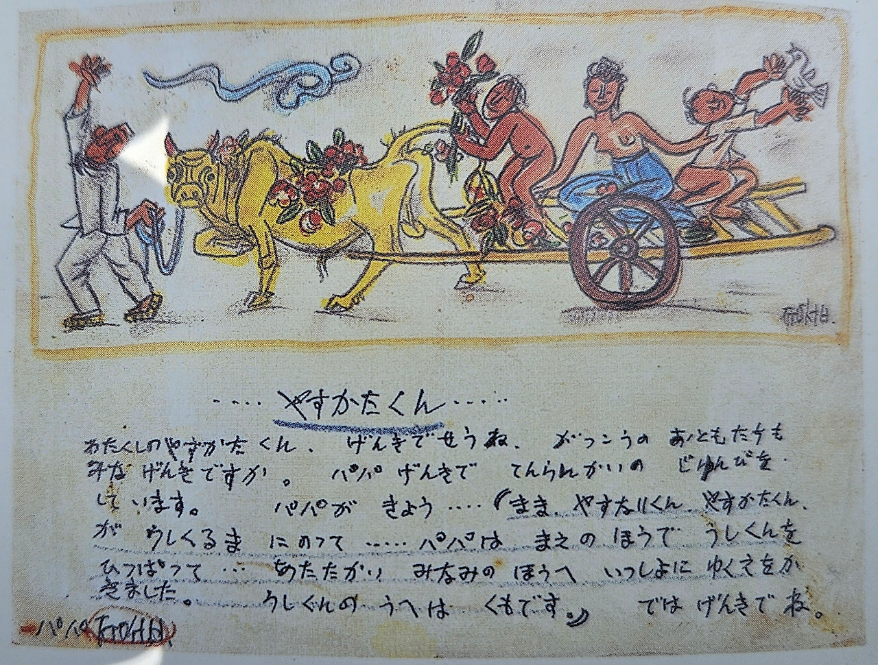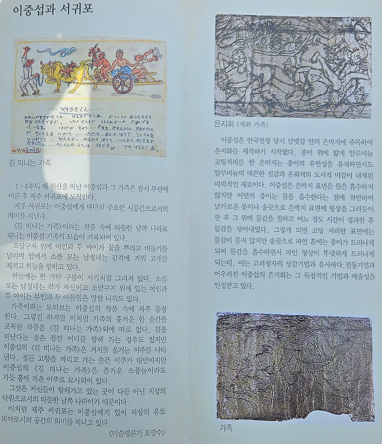1.4 후퇴 때 원산을 떠난 이중섭과 가족은 부산을 경유 제주도 서귀포에 도착했다. 따뜻한 남쪽 나라로 떠나는 가족의 모습을 그렸다. 자신과 부인(마사코, 이남덕)과 두 아들이다. 흥겨운 순간을 그린 작품은 거의 유일하다. 서귀포는 그에게 지상의 유토피아였다.