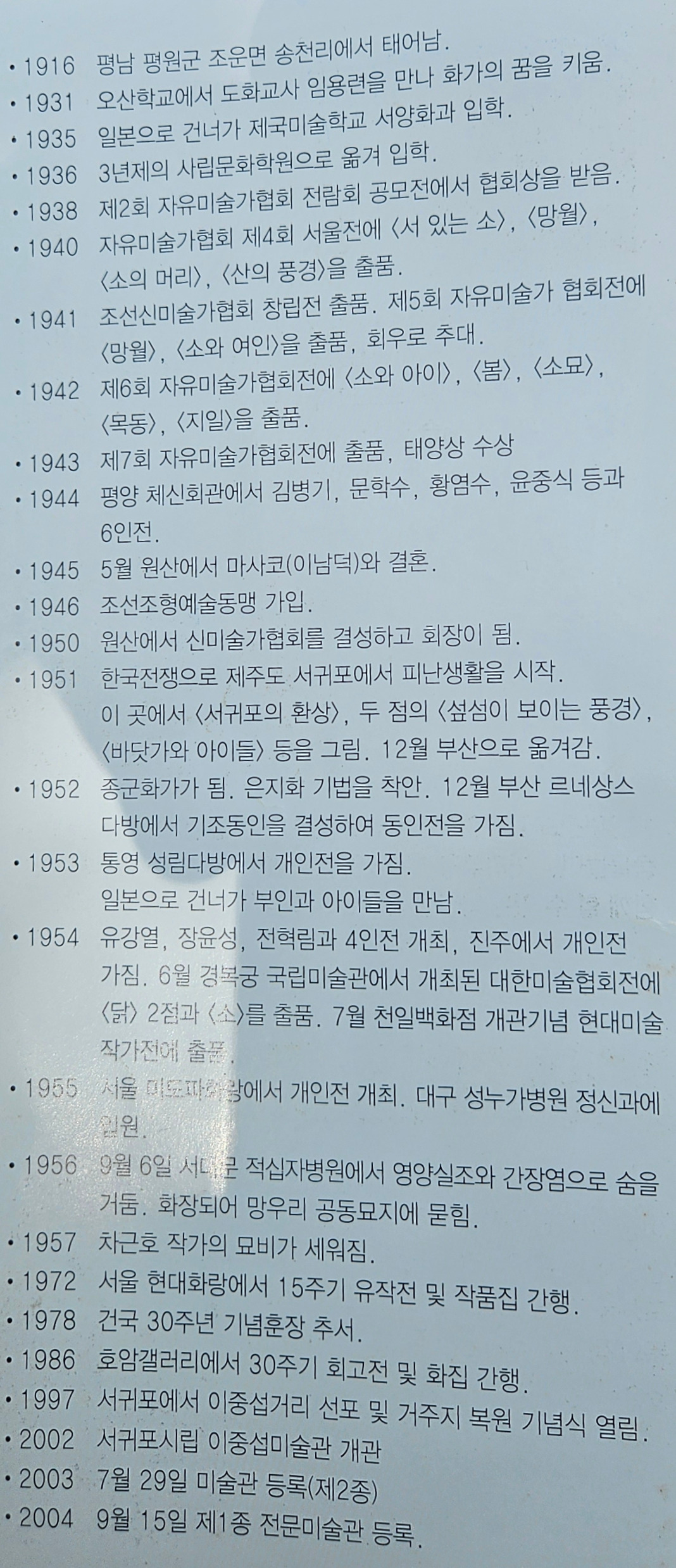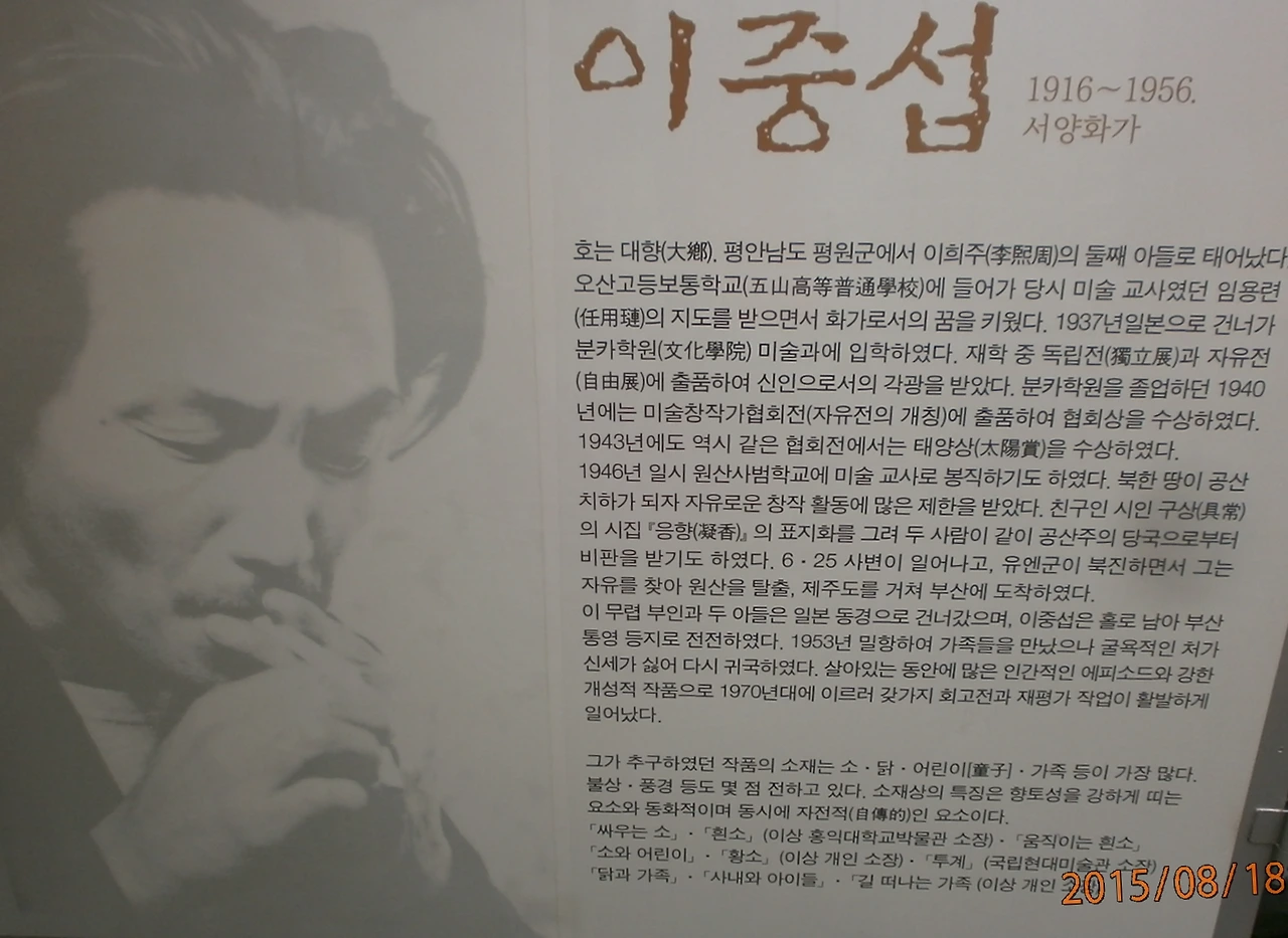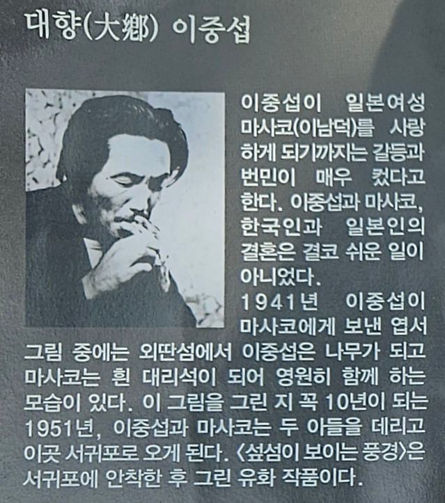 이중섭 화가는 1951년 1월부터 같은 해 12월까지 한국전쟁을 피해 서귀포로 피난 생활을 했다. 서울 중랑구 망우 역사문화공원에 묘소가 있다.