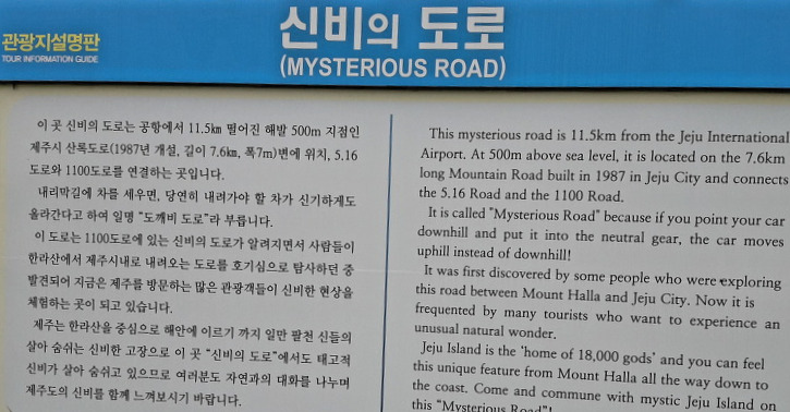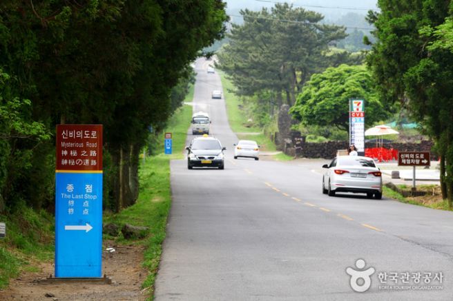 신비의 도로 혹은 도깨비 도로로 불린다. 내리막길에 차를 세워두면 아래로 내려가야 하는 차가 내려가지 않고 오히려 오르막 쪽으로 뒷걸음치는 기이한 도로다. 사실은 오르막길이 보이는 쪽이 경사 3도가량의 내리막 길이여서 단순 착시 현상에 의해 올라가는 것처럼 보인다고 한다. (출처 : 제주 문화관광 홈페이지)