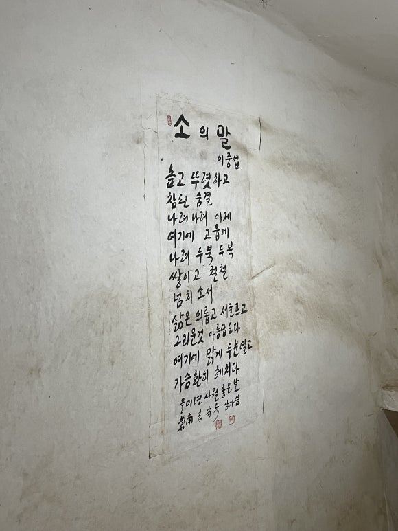 자원봉사하시는 마을 어르신이 이중섭의 '소의 말' 시를 무료로 써 주는 봉사활동을 하고 계셨다. 시간에 쫓겨, 부탁드릴 마음의 여유가 없었다. 아쉬웠다.