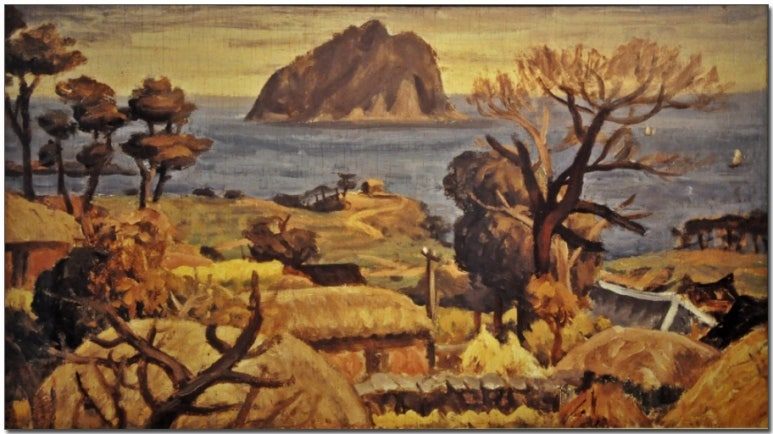 서귀포 앞바다에 떠 있는 섶섬을 그렸다. 멀리 바다를 배경으로 왼쪽 근경에 큰 나무 두 그루가 서 있고, 오른쪽으로는 돌담과 초가집이 나지막이 자리하고 있다. 담 너머로 이웃집 지붕과 눌, 우영팟(텃밭)과 녹색 귤나무가 보인다. 마당에 보이는 점경 인물과 바다에 떠 있는 흰 돛단배, 새잎이 돋아나지 않은 나무가 봄을 기다린다.(출처 : 이중섭 미술관 팸플릿)