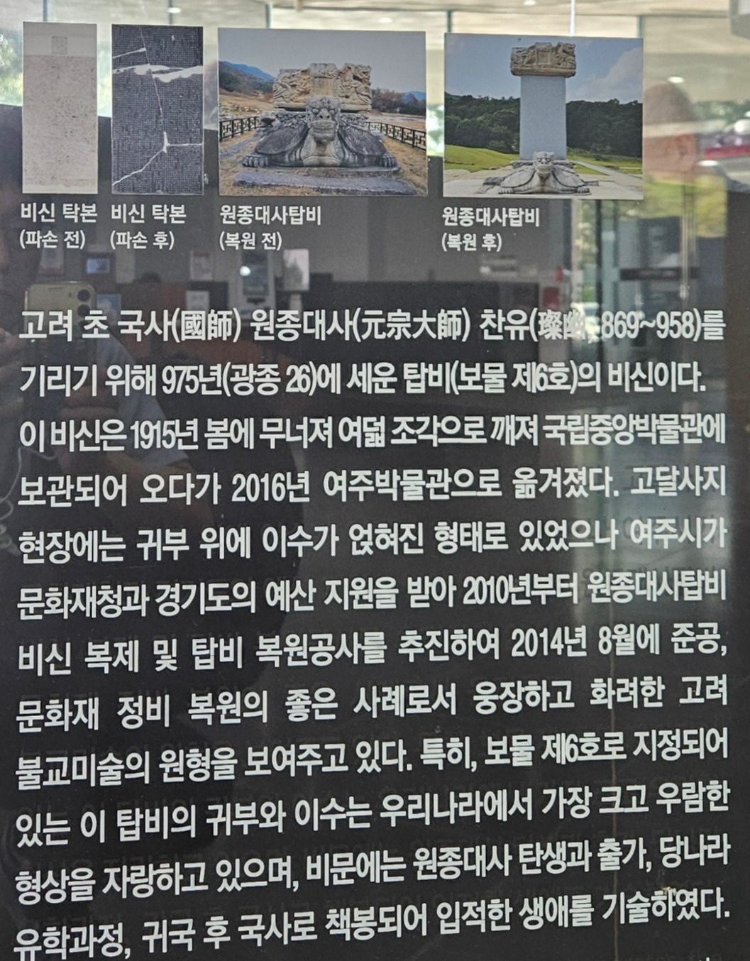 원향사라는 명문이 출토되어 사찰명을 확인했다. 고달사는 고려 3대 선종 사찰의 하나였다. 박물관 1층 입구에 고달사지 원종대사 탑비가 누워 있다. 국립중앙 박물관에서 보관해 오던 것을 여주 박물관으로 이전하여 전시하고 있다.