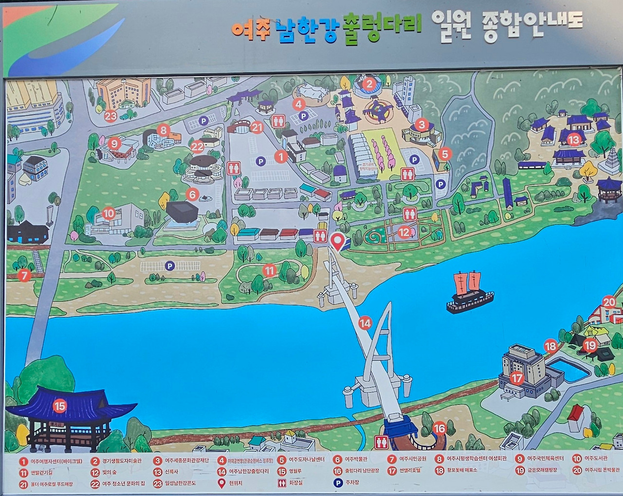 2025.5.1. 개통되었다. 무료다. 박물관과 신륵사 관광 후 여강(驪江) 위 출렁다리를 통해 영월루 영월루 앞 황마(黃馬)와 여마(驪馬)의 전설이 깃든 마암(馬巖) 쪽으로 넘어갈 수 있다. 연장 515m, 폭 2.5m, 높이 35m인 현수교다.