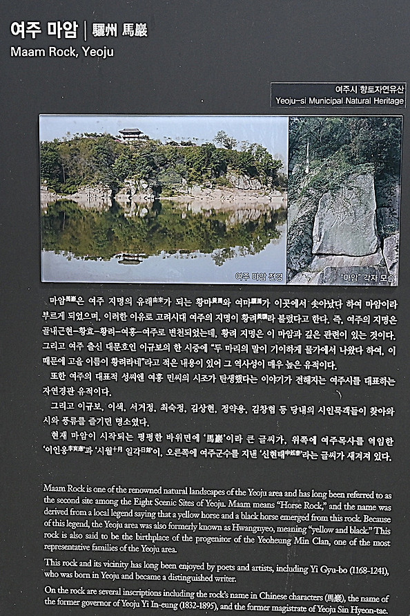 영월루 앞 마암(馬巖)에서 황마(黃馬)와 여마(驪馬)가 승천했다는 전설이 있다. 여주 여흥 민 씨 시조 탄생 설화가 전해져 내려온다. 고려시대 여주 지명을 황마와 여마의 첫 글자를 따서 황려라고 불렀다. 즉 여주의 지명은 골내근면-황효-황려-여흥-여주로 변천되었다. 영월루와 여주 박물관/신륵사 사이로 여강(驪江)이 흐른다.