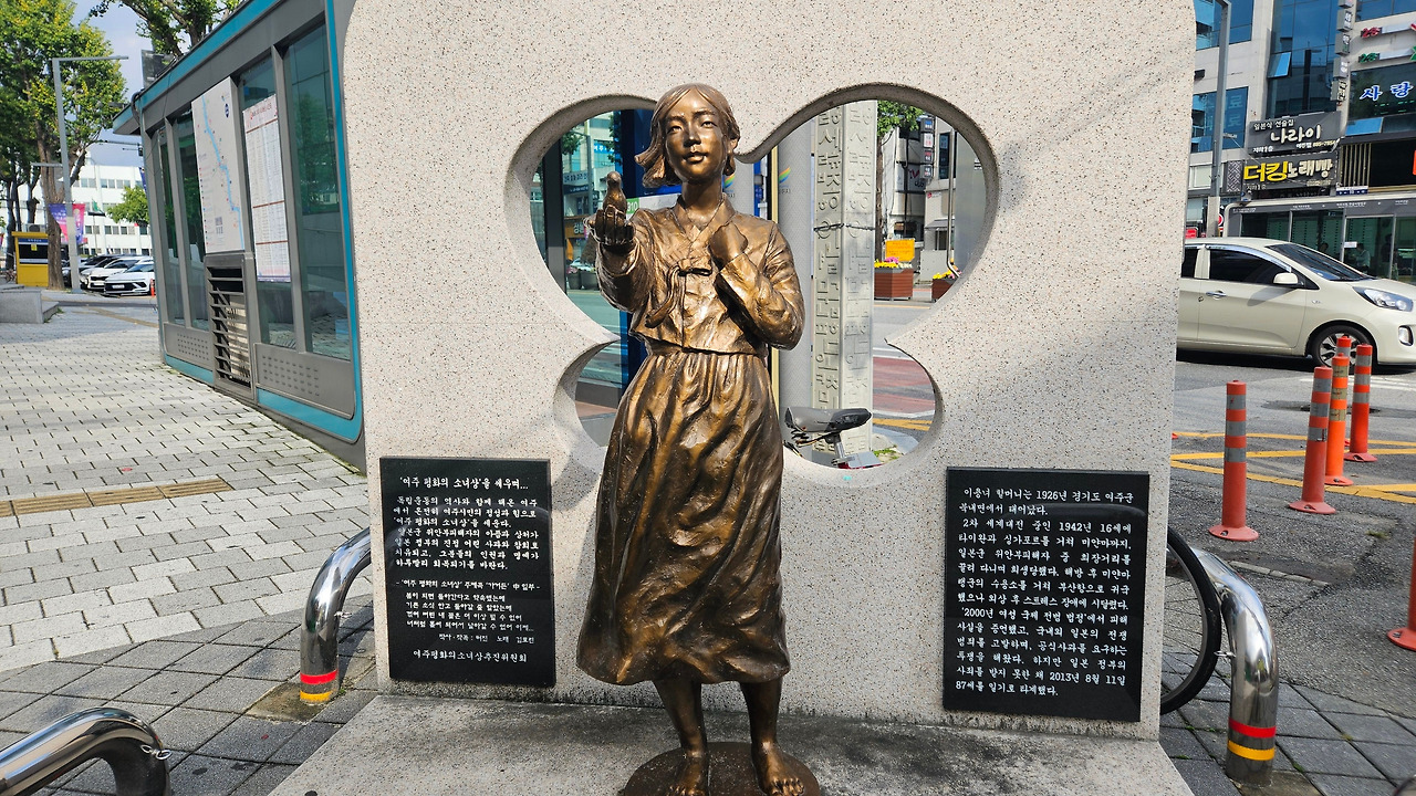 한글 시장 입구에 세워져 있다. 일제 강점기 16살 어린 소녀상이다. 위안부 피해자 이용녀 할머니(1926년 2월 10일~ 2013년 8월 13일, 87세 영면)는 여주에서 태어나셨다. 열여섯 살인 1941년 강제 연행돼 싱가포르와 미얀마 등지에서 고초를 겪으시다가 해방 후 랑군수용소를 거쳐 1946년 부산항으로 귀국하셨다.