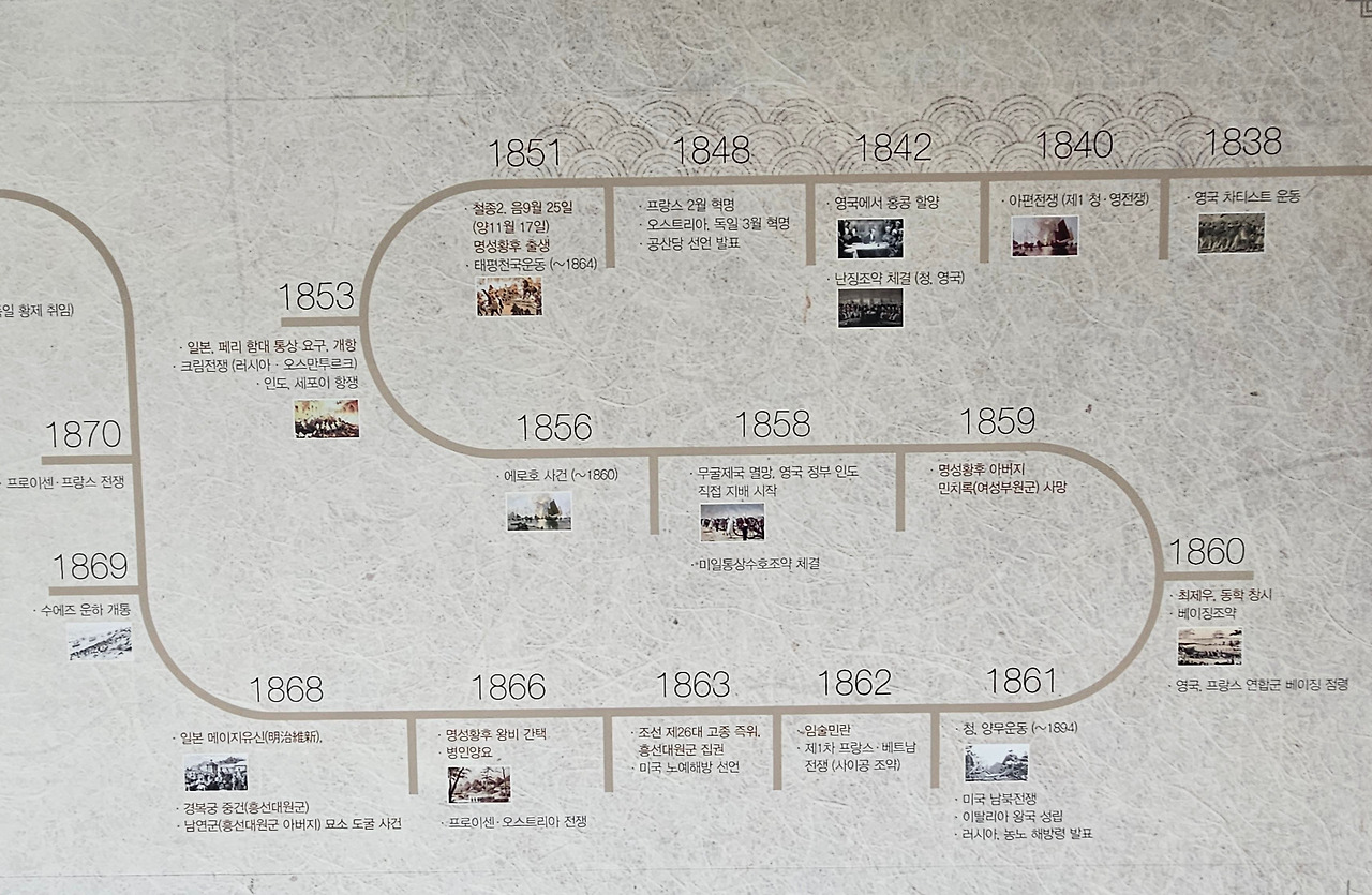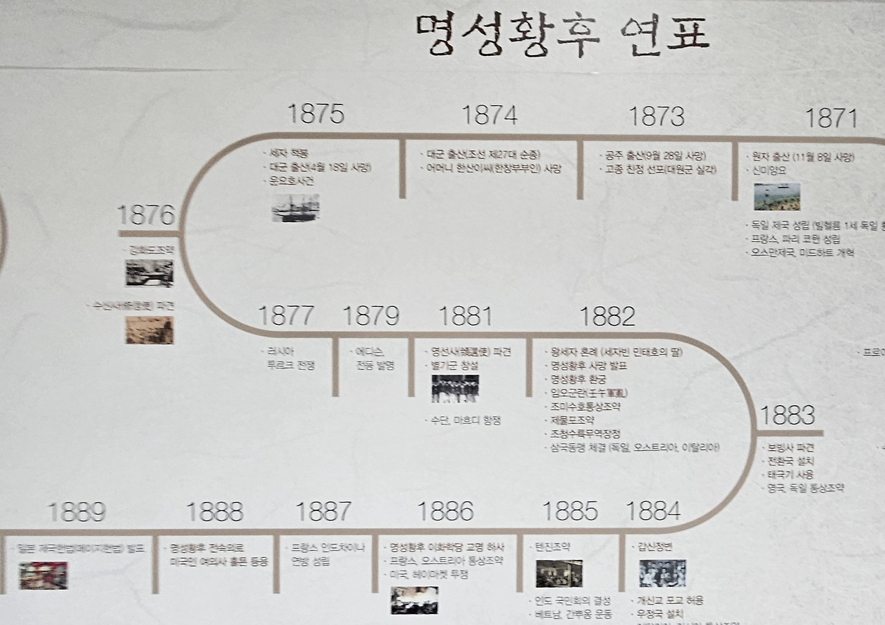 -. 임오군란 : 1882년 6월 9일(음) 발생, 명성황후는 충주목 민은식의 집으로 피신. 흥선대원군이 재집권하고 명성황후가 죽은 것으로 잘못 판단하고 장례식까지 치름. 반란군 진압됨. 흥선대원군은 청으로 납치되어 3년간 유폐됨, 일본과 제물포조약