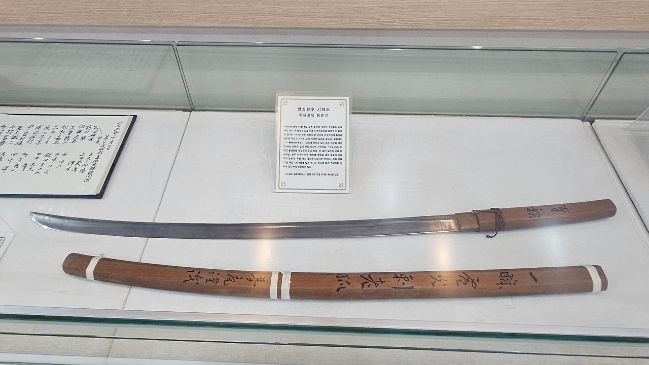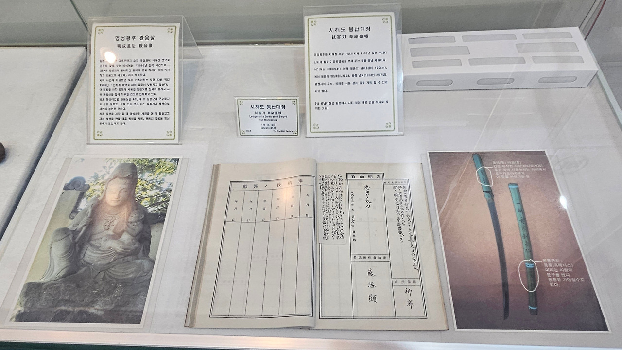 칼(1m 20cm, 칼날 길이 90cm)을 3인 중 두 번째로 휘두른 일본 낭인(토오 가츠아키, 藤勝顯)이 반성하며 깊이 뉘우치며, 1908년 일본 후쿠오카의 쿠시다 신사(櫛田神社)에 칼을 맡겼다고 한다. 관련 범인들은 증거 불충분으로 무죄 석방되었다. 현재 신사 금고 속에 보관 중이다. (기념관내 물건은 일본에서 사진 촬영해 온 것을 토대로 다시 복제한 것임)
