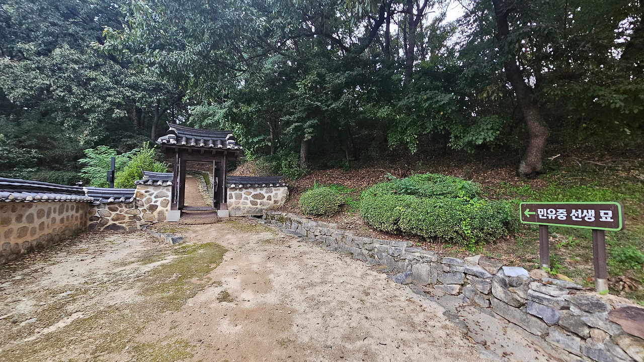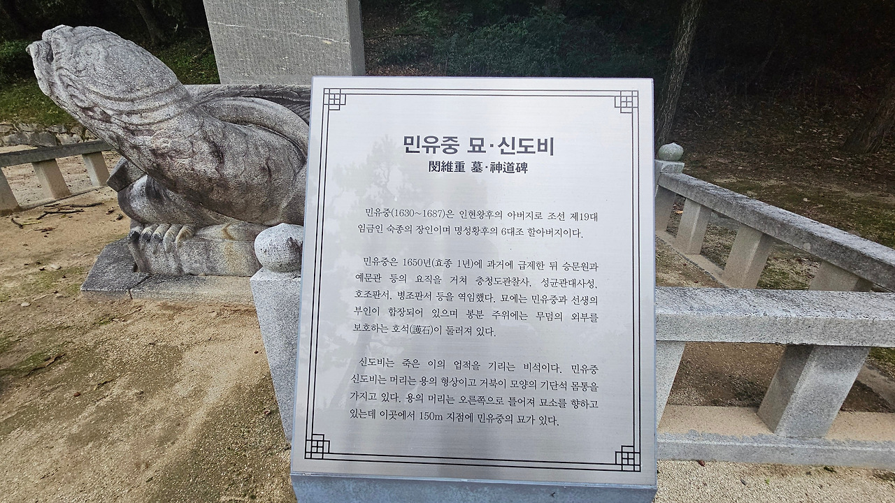 민유중(1630~1687) 선생은 조선 제19대 숙종의 왕비인 인현왕후의 아버지다. 명성황후의 아버지 민치록은 민유중의 5대 손이다. 효종 원년(1650) 과거에 급제한 뒤 승문원을 거쳐 전라도 관찰사, 형조판서, 호조판서 등을 역임했다. 숙종 7년(1681)에 민유중의 차녀가 숙종의 계비(인현왕후)가 되며 여양부원군에 봉해졌다. 노론의 중진이었다. 명성황후생가유적지 뒤쪽 구릉에 있고, 묘소로 가는 길목에 민유중의 업적을 기리는 신도비가 세워져 있다.