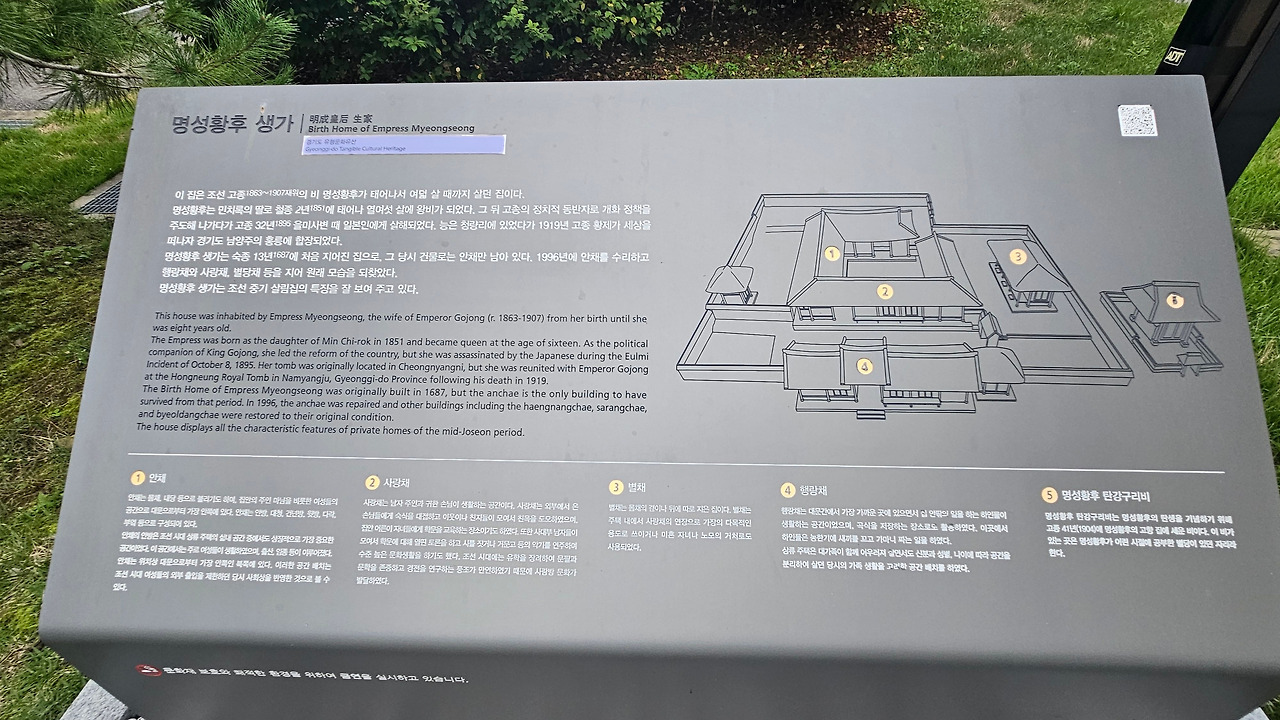 여주여행자센터에서 탄 택시가 명성황후 생가 관람 매표소 문을 마감 1시간 전에 무사히 통과하였다. 왠지 설레며 긴장이 되었다. 명성황후 기념관에서 일대기 기록과 각종 자료를 보고, 분한 마음이 들었다. 특히 경복궁 옥호루에서 돌아 가심을 애통해했다. 힘을 길러 다시는 외국에 의한 국권이 유린되는 일이 절대로 없어야 되겠다는 생각이 들었다.
