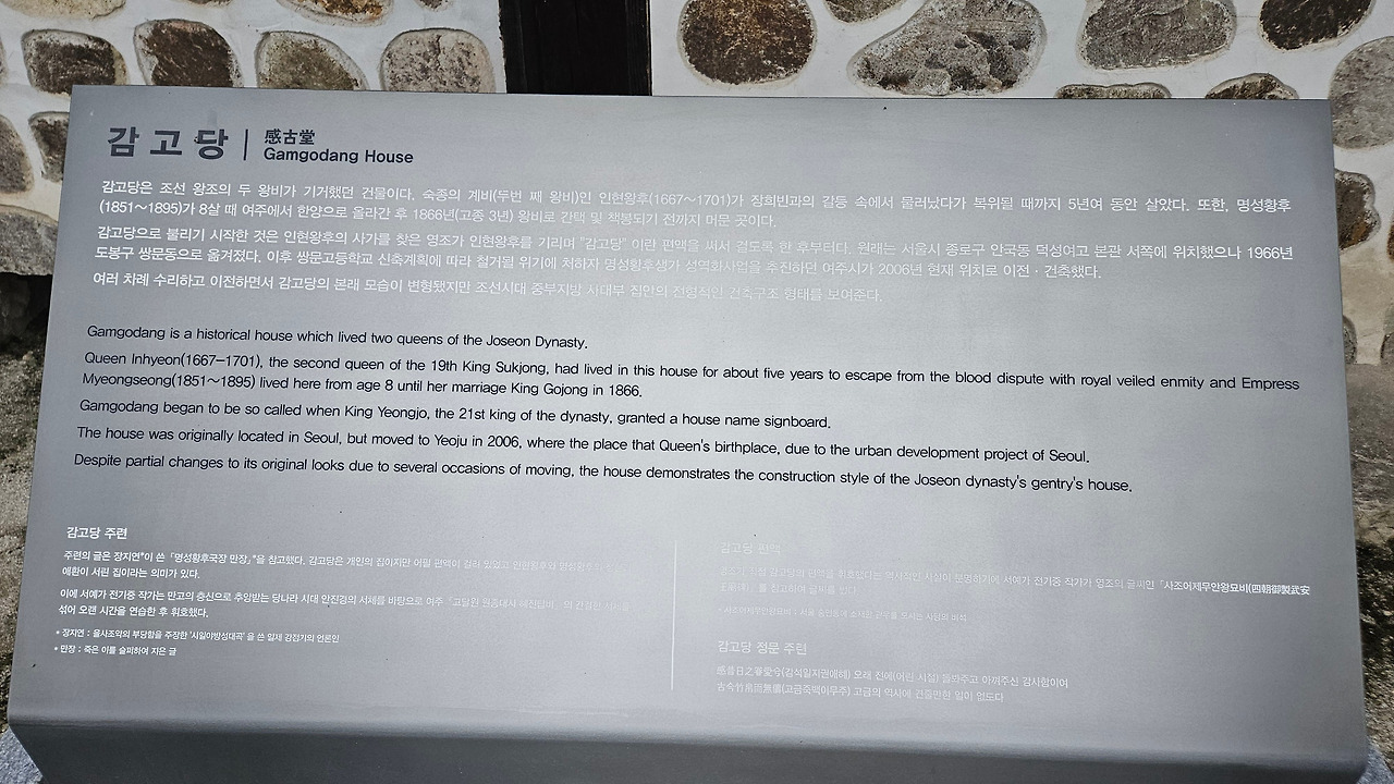 감고당은 조선 제19대 숙종의 왕비인 인현왕후가 친정을 위해 지은 건물로서 조선의 두 왕비가 기거했던 건물이다. 희빈 장 씨의 모함을 받아 폐위된 인현왕후가 복위될 때까지 약 5년여 동안 머물렀다. 명성황후가 8살의 나이로 여주에서 한양으로 올라간 후 1866년(고종 3) 왕비로 책봉되기 전까지 살았던 건물이다.