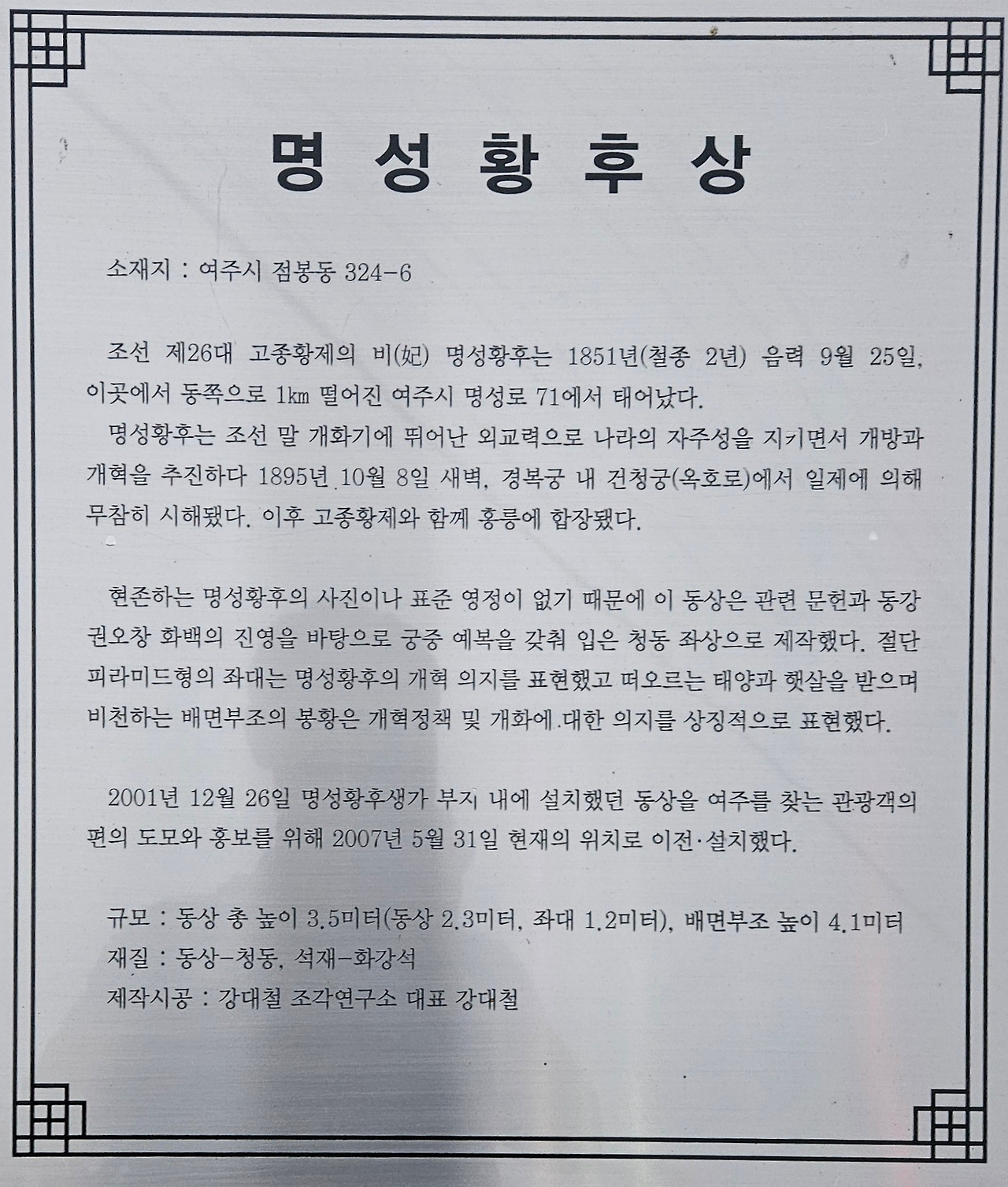 당초 명성황후생가 부지 내에 설치했던 동상을 약 1km 현재의 위치(여주시 점봉동)로 이전 설치하였다.