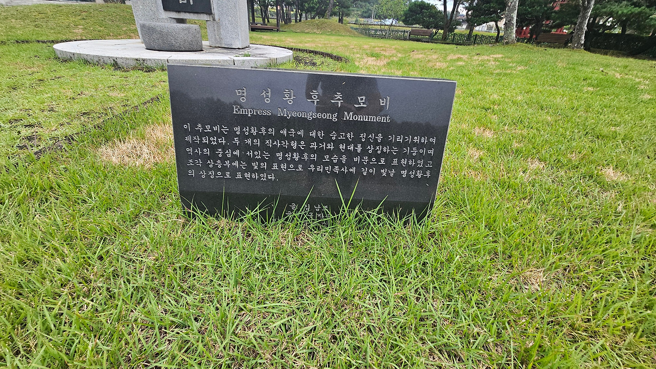 명성황후를 추모하기 위해 명성황후 기념관 앞에 세운 추모비다. 2개의 직사각형은 과거와 현대를 상징하는 기둥이며 좌측 상층부에 빛나는 태양은 우리 민족사에 길이 빛날 명성황후를 상징하고 있다.