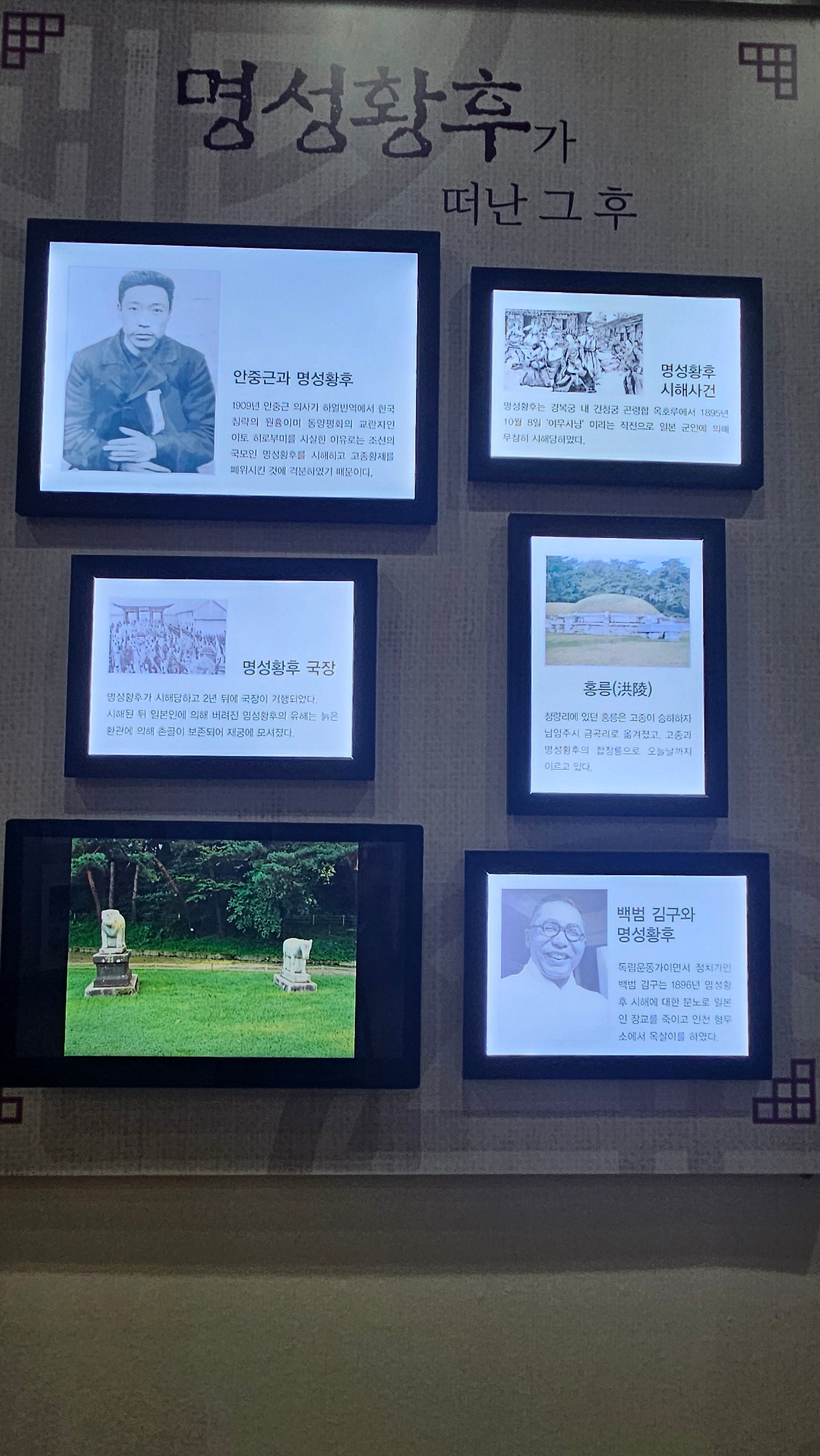 백범 김구 선생이 분노로 일본군 장교를 죽이고 사형을 선고받고 형무소에서 옥살이하였다. 안중근의사는 1909년 만주 하얼빈에서 침략의 원흉 이토 히로부미를 처형하였다. 시해 2년 후 국장이 거행되었다. 청량리에 있던 홍릉은 고종 승하 후 남양주시 금곡리로 옮겨졌고, 고종과 명성황후의 합장릉으로 모시고 있다.