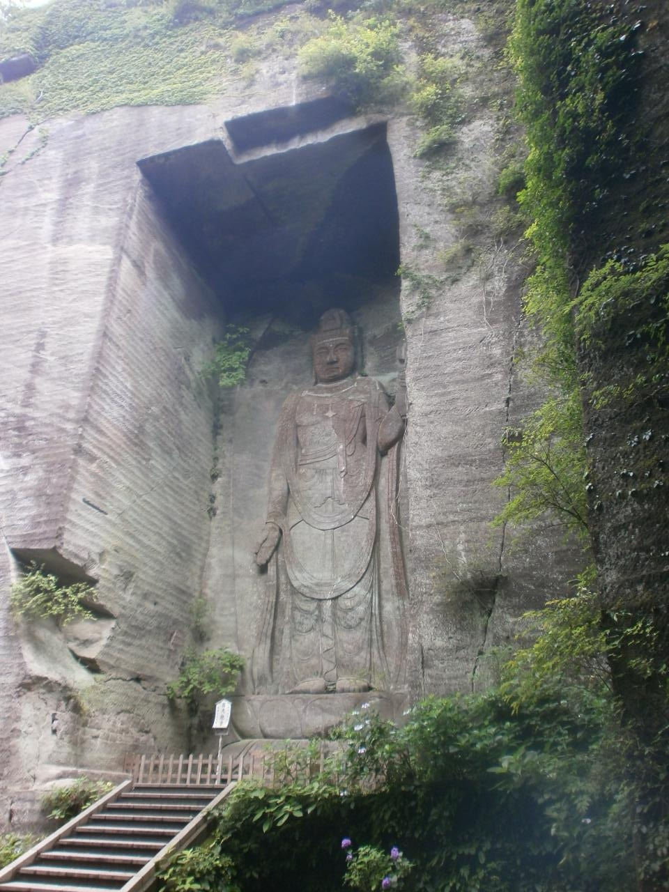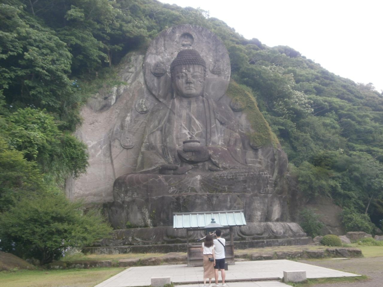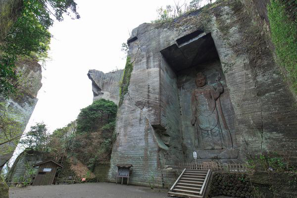 1783년 大野甚五郎英令(hidenori) 문하, 27 명의 제자가 바위를 3년간 조각하면서 세워졌다. 발기 당시의 높이는 약 37.7m였다. 그러나 수년 동안 비와 바람에 의해 침식되었고, 에도 시대 말기에는 지진등으로 인한 심각한 피해로 붕괴 상태였다. 복원 작업은 1979년에 완성되었다. 동상의 높이는 31.05m로 원래 유형보다 약 7m 낮아졌다. 나라 지방에 있는 큰 부처님이 18.18m이고, 가마쿠라의 큰 부처님이 13.35m라는 것을 고려하면 압도적인 크기라고 한다.