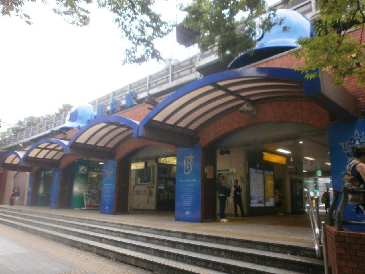 간나이 역(출입구 상단에 요코하마 팀 상징 대형 야구헬멧이 올려져 있다)