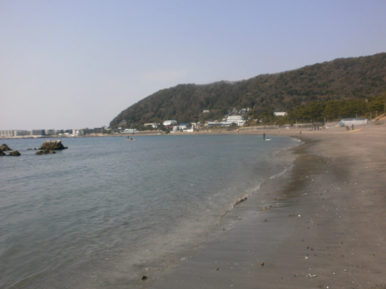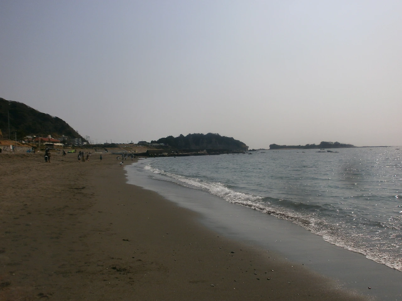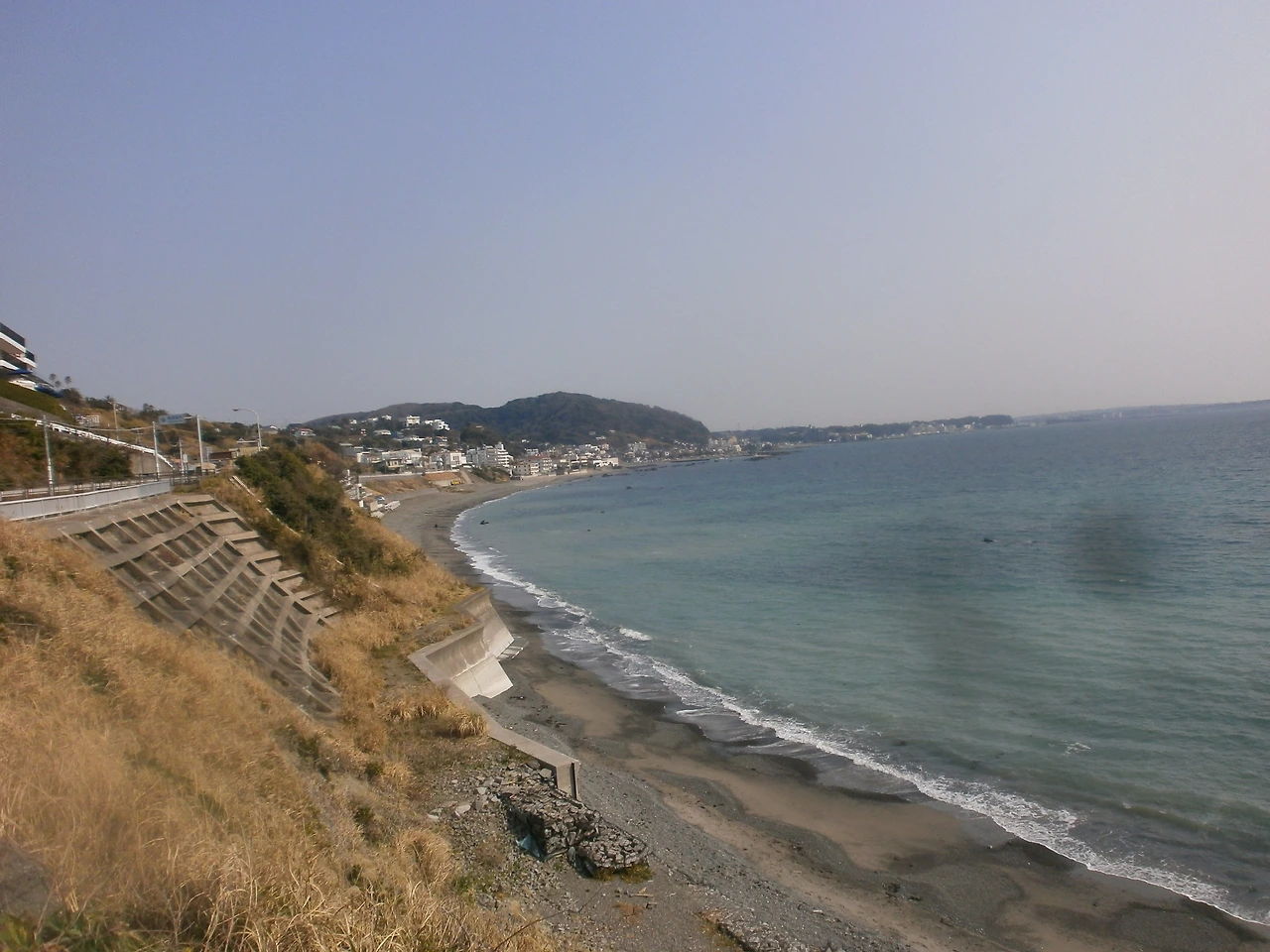 진행 방향으로 보았을 때, 시계 6시 방향에서 12시 방향으로 휘어진 해변이 아름답다. 멀리 가마쿠라의 에노시마가 보인다.