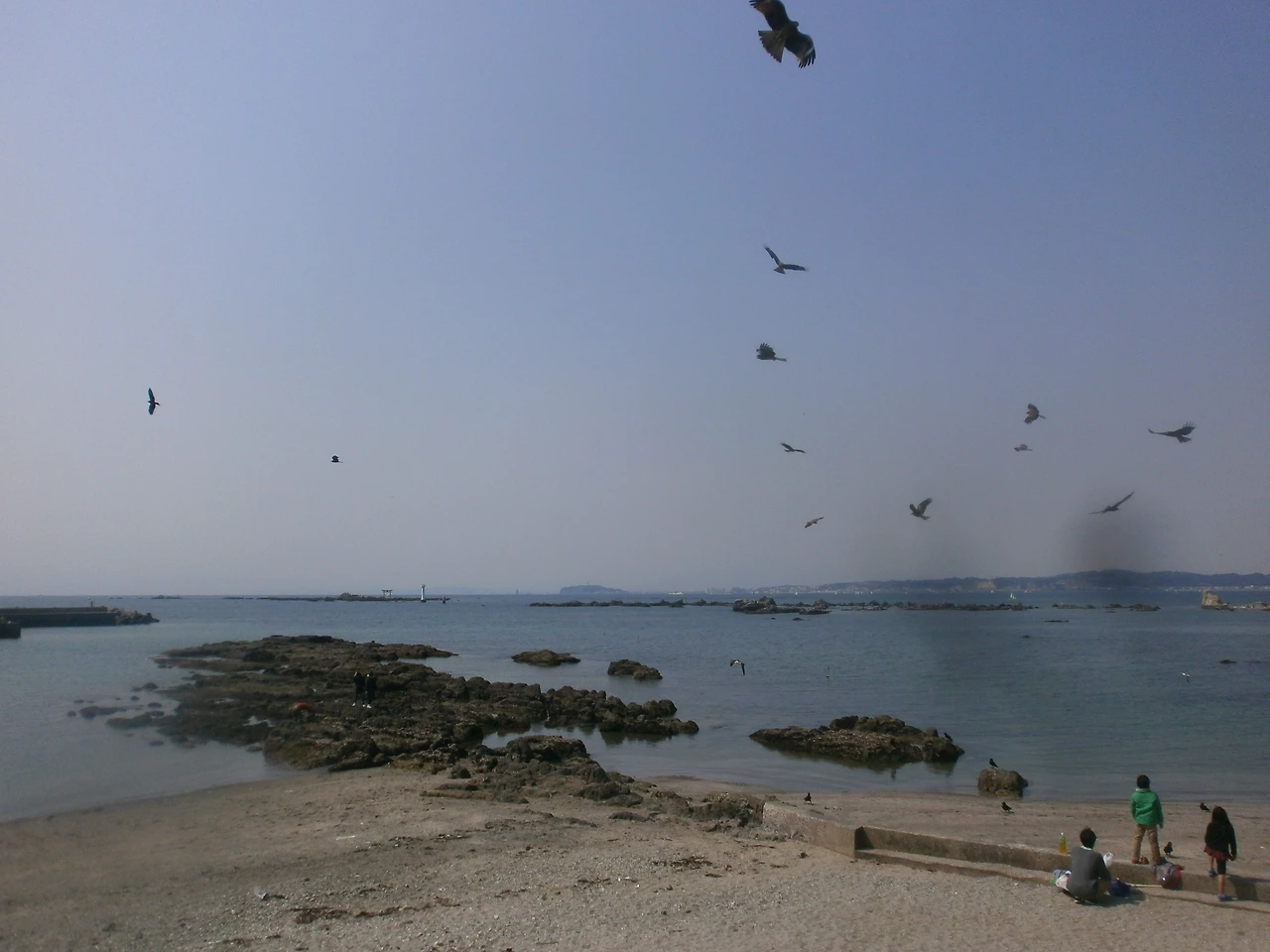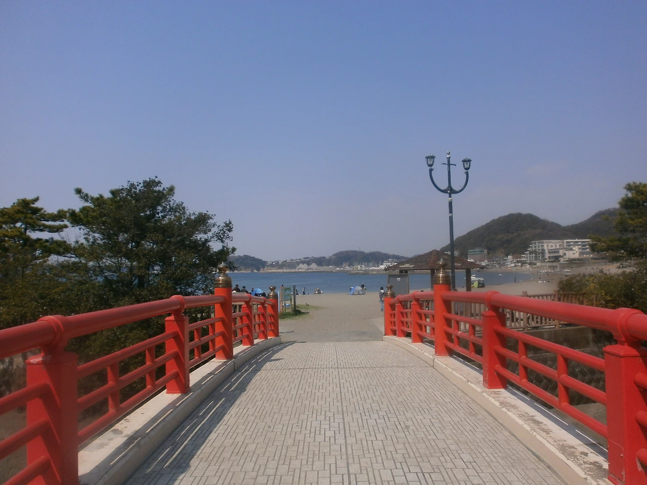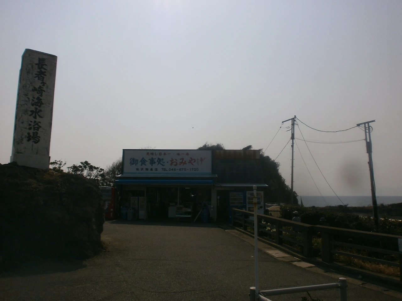 진행 방향으로 보았을 때, 시계 6시 방향에서 12시 방향으로 휘어진 해변이 아름답다. 멀리 가마쿠라의 에노시마가 보인다.