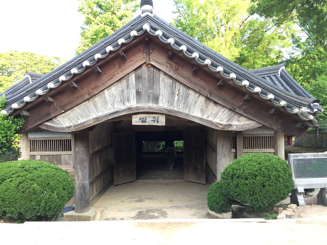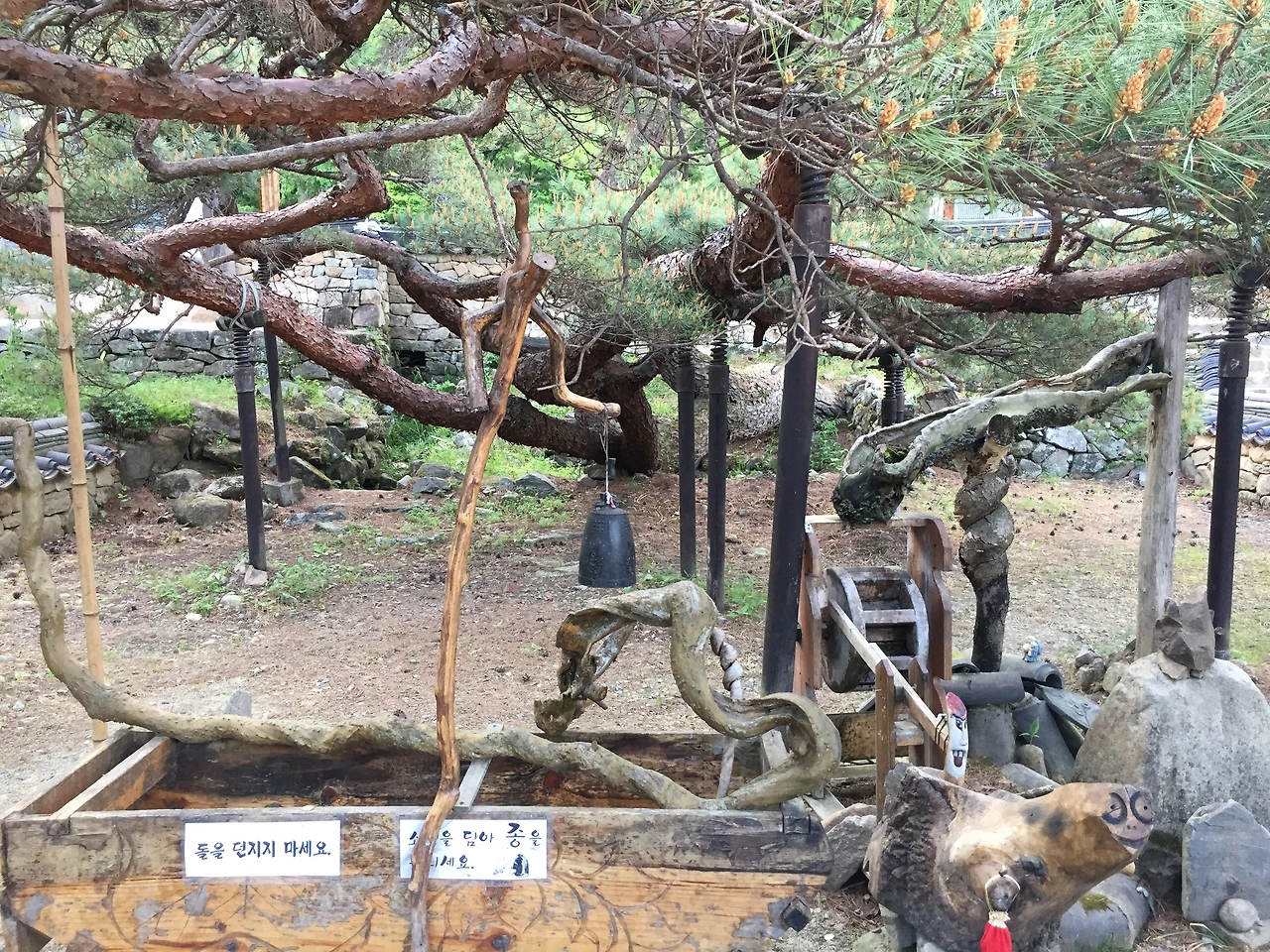 등 굽은 소나무 노송과 조그마한 사각형 연못 그리고 그 아래에 해우소가 있다.