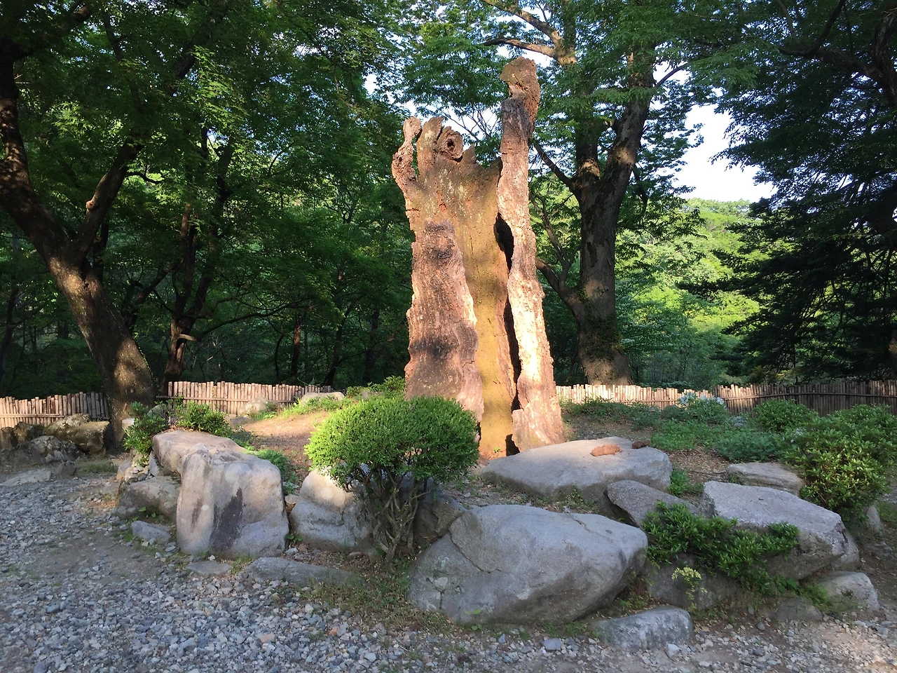 일주문 올라가기 직전 우측에 햇수를 알 수 없는 고목이 계곡 물소리를 들으며 묵묵히 서 있다. 가지는 오래전에 사라지고 기둥의 상단 부분도 삭아 없어졌다. 속이 비워진 고목이지만 항상 경건한 마음이 든다. 인간의 마지막 모습과도 많이 닮았다.