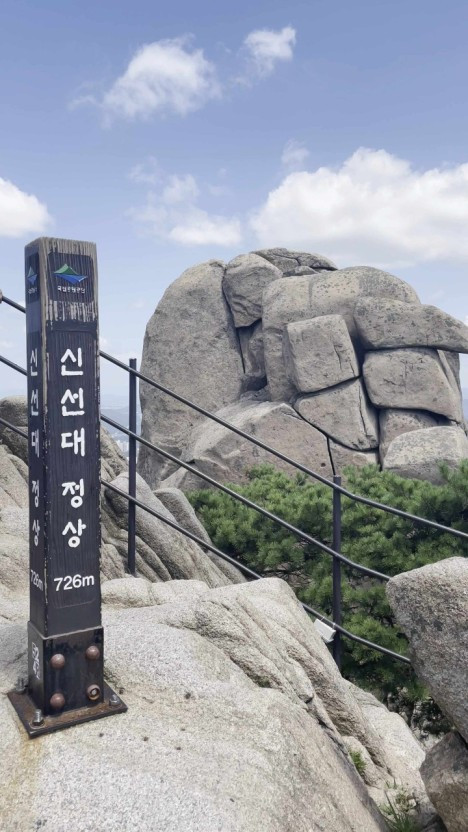 소나무와 화강암이 조화를 잘 이룬다. 애국가의 ‘남산 위에 저 소나무 철갑을 두른 듯’ 바위 틈새에 뿌리를 박고 소나무가 굳건하게 자생하고 있다. 가장 한민족다운 모습이 아닐까 하는 생각이 저절로 든다. 철제 난관을 움켜잡고 올라가야 된다. 내려올 때도 쇠줄 혹은 난간을 잡고 뒷걸음치며 내려와야 된다. 신선대 정상은 좁은데 많은 사람으로 붐볐다. 마침내 정상 표지목(726m)을 부여잡고 의미가 있는 인생 증명샷을 찍었다. 아주 어려운 등산이었다. 그만큼 추억에 남는다.