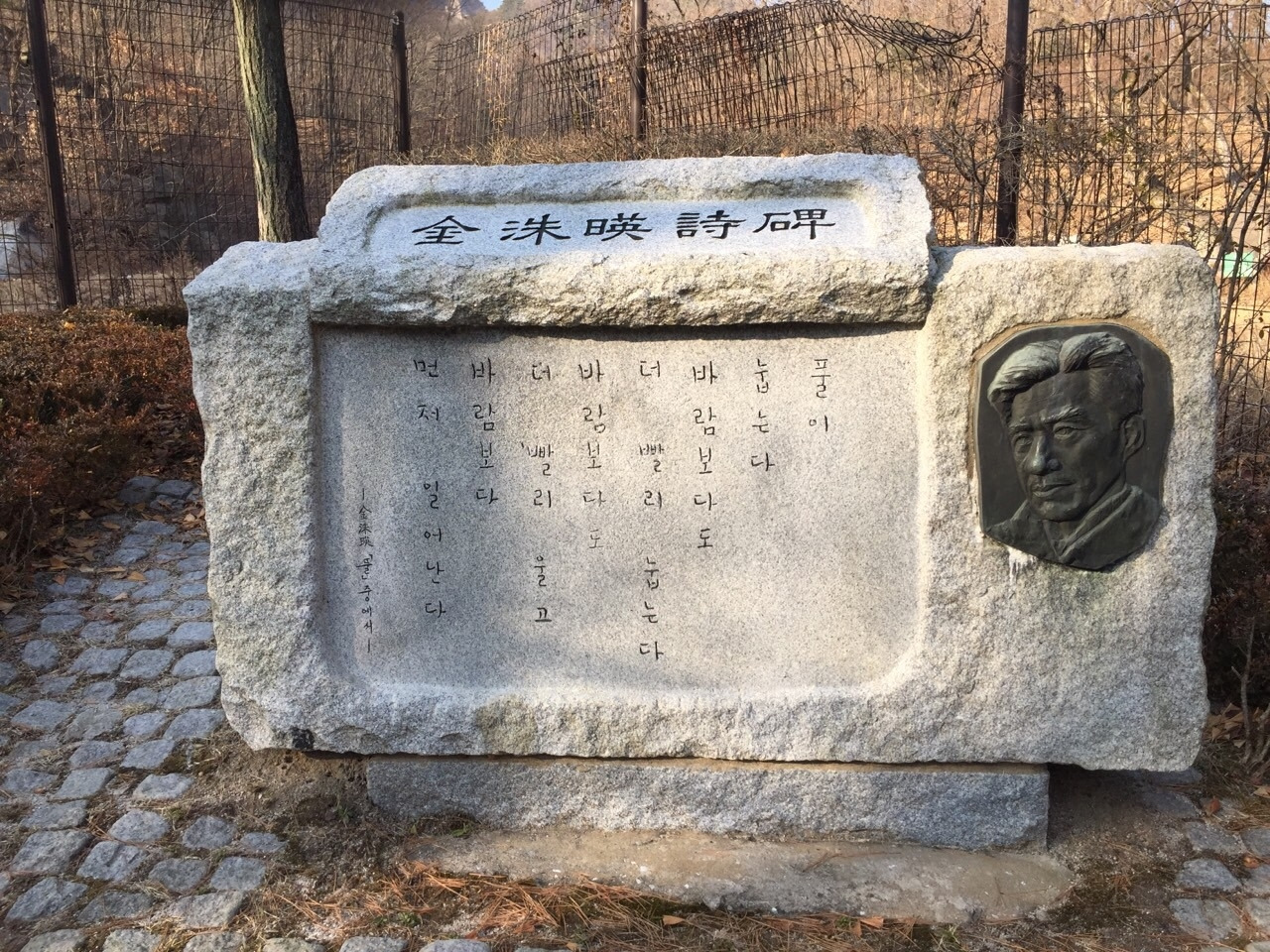 풀의 시인 김수영(金洙暎, 1921년 ~ 1968년) 시비가 등산로 바로 옆에 있다. 서울 종로구 관철동에서 8남매의 장남으로 태어났다. 어린 시절 병약했으며, 선린고등상업학교를 졸업했다. 이후 일본의 도쿄대학 상과에 입학하였다.